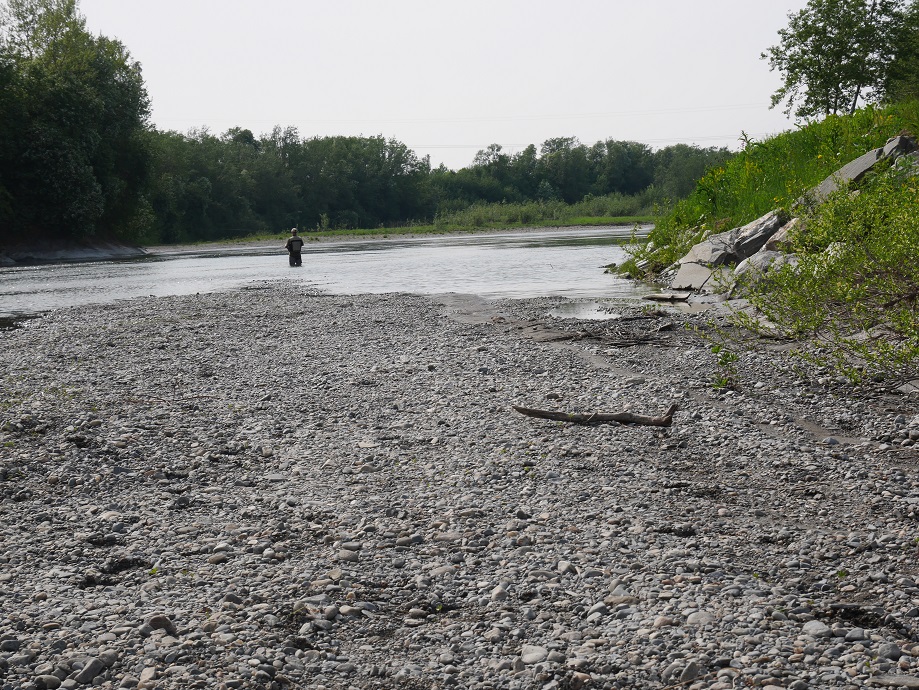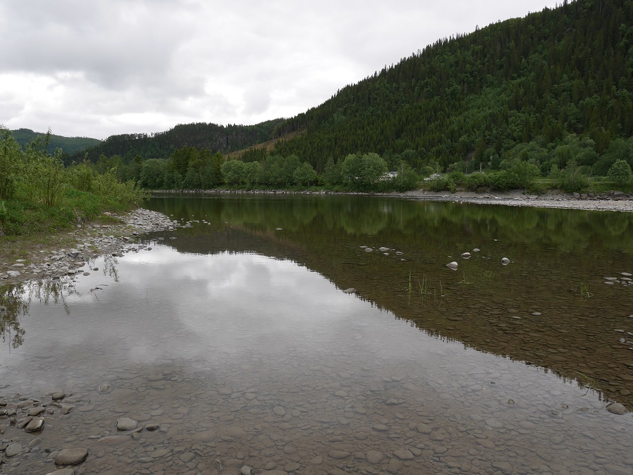 Die Stjørdalselva ist hier rund 30 bis 60 Meter breit. Die Angelstrecke von Ertsgaard Camping ist in etwa einen Kilometer lang. Hier findet Ihr ruhige und tiefe Zonen mit Kiesbänken, aber auch einige schnellfließende Gewässerabschnitte. Die Tageskarte kosten ca. 25 Euro, für norwegische Verhältnisse fast ein Schnäppchen. Ich teile mir im Moment die Strecke mit drei weiteren Anglern und bin somit fast alleine am Wasser. Apropos Wasser – die Wassertemperatur beträgt 9° C.