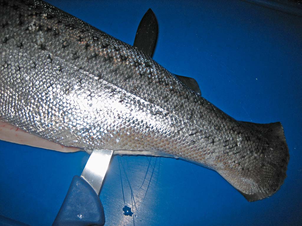 - An dieser Schnittstelle wird das Messer auf der Mittelgräte senkrecht durch den Schwanzstiel nach oben durchgestochen und das Schwanzfilet mit einem gleichmäßigen Schnitt zur Schwanzflosse abgelöst.