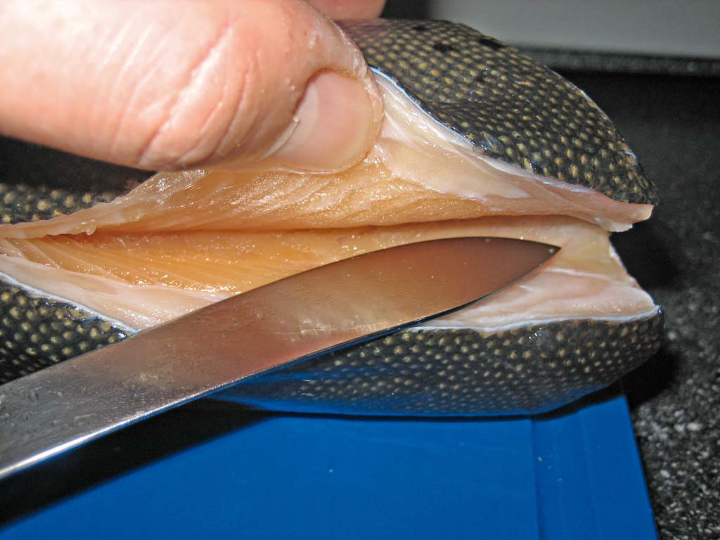 - Mit der Messerspitze wird nun gleichmäßig von vorne nach hinten auf den Gräten entlang geschnitten.