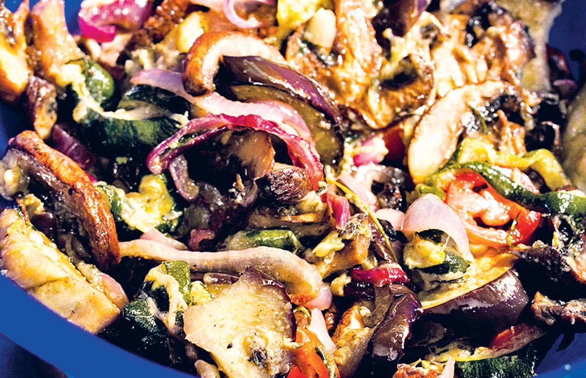 - Aubergine, Zucchini, Zwiebel und Champignons in dicke Scheiben schneiden und auf dem Backblech verteilen. Mit grobem Meersalz, Pfeffer, frischem Thymian und Olivenöl würzen. Bei 200°C im Ofen 20 Minuten lang backen.