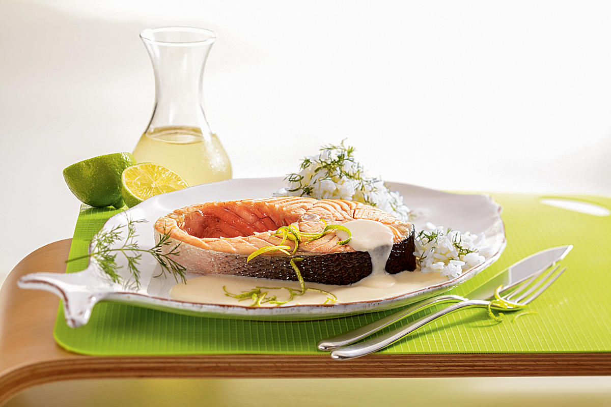 - Lachssteaks mit der Sauce anrichten, mit Limettenzesten und Dill garnieren. Dazu Reis servieren. Guten Appetit!
