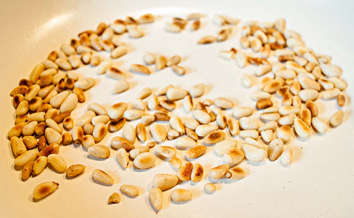 - Die Pinienkerne in einer beschichteten Pfanne rösten, bevor sie in den Reis kommen. Auf Öl oder Butter könnt Ihr dabei getrost verzichten, da Pinienkerne genug eigenes Fett enthalten.