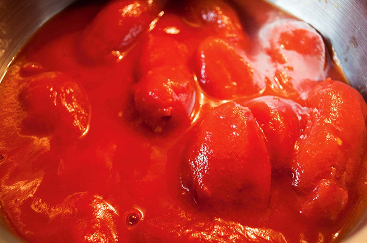 - Für die Soße benötigt Ihr eine Dose Tomaten. Ihr könnt entweder die passierte Variante wählen oder – wie hier – die mit ganzen Stücken.