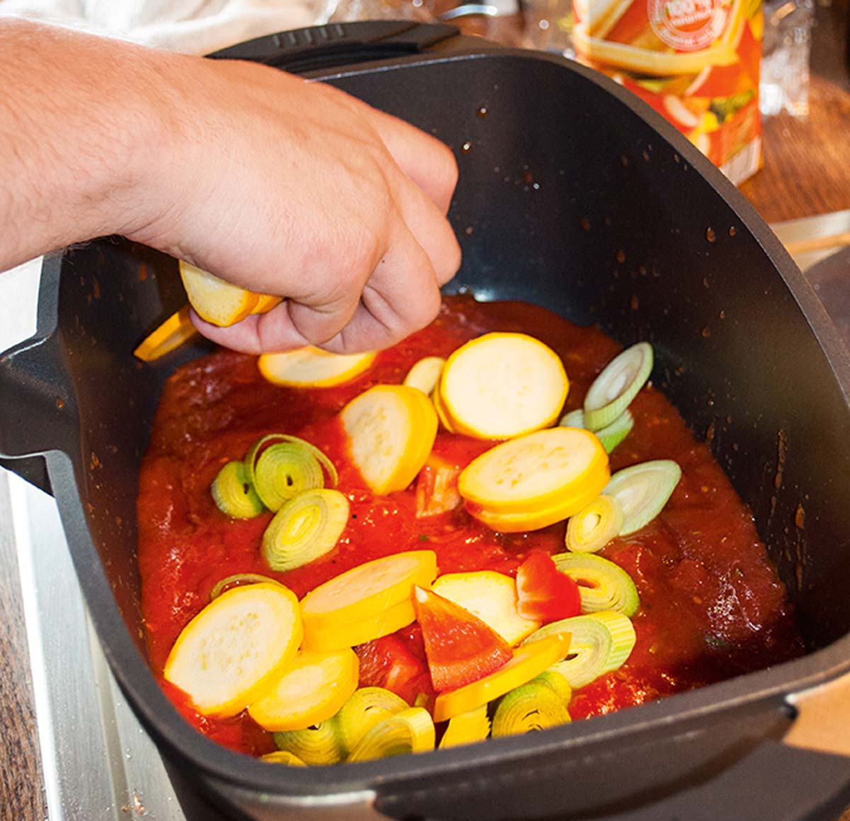 - Das geschnittene Gemüse kommt nun zusammen mit der Tomatensoße in einen tiefen Bräter. Das Gemüse und die Soße müssen gut miteinander vermischt werden. Den Backofen auf 200 Grad vorheizen.