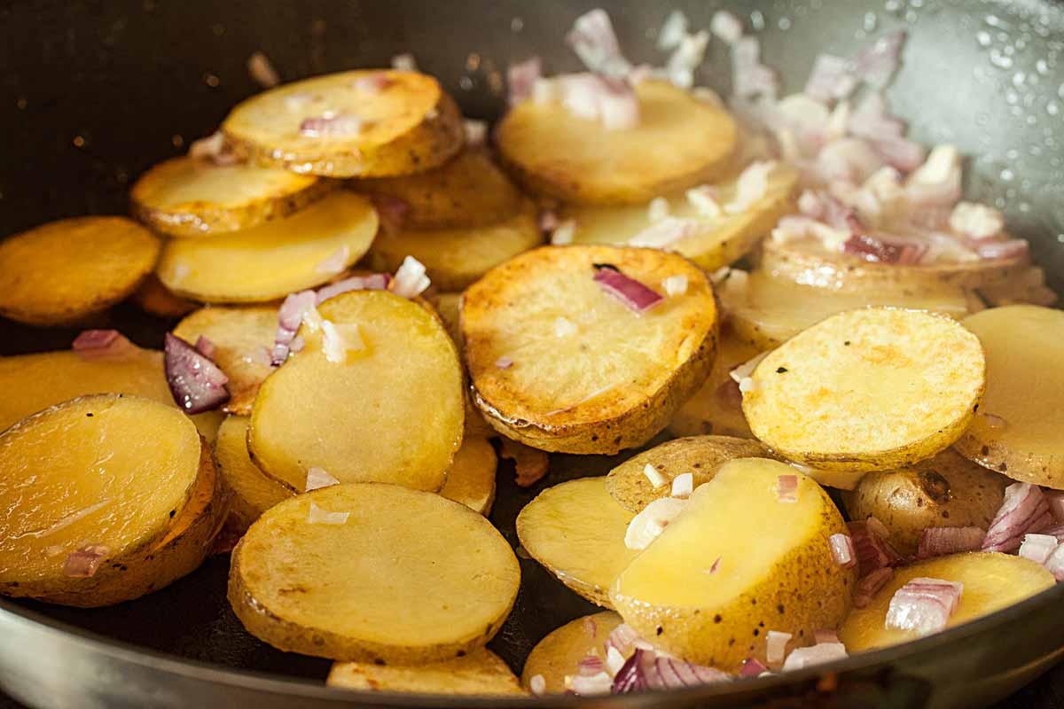 Schneidet die Kartoffeln in Scheiben und bratet sie in der Pfanne an. Zwiebel und Knoblauch kommen kurz vor Schluss dazu!