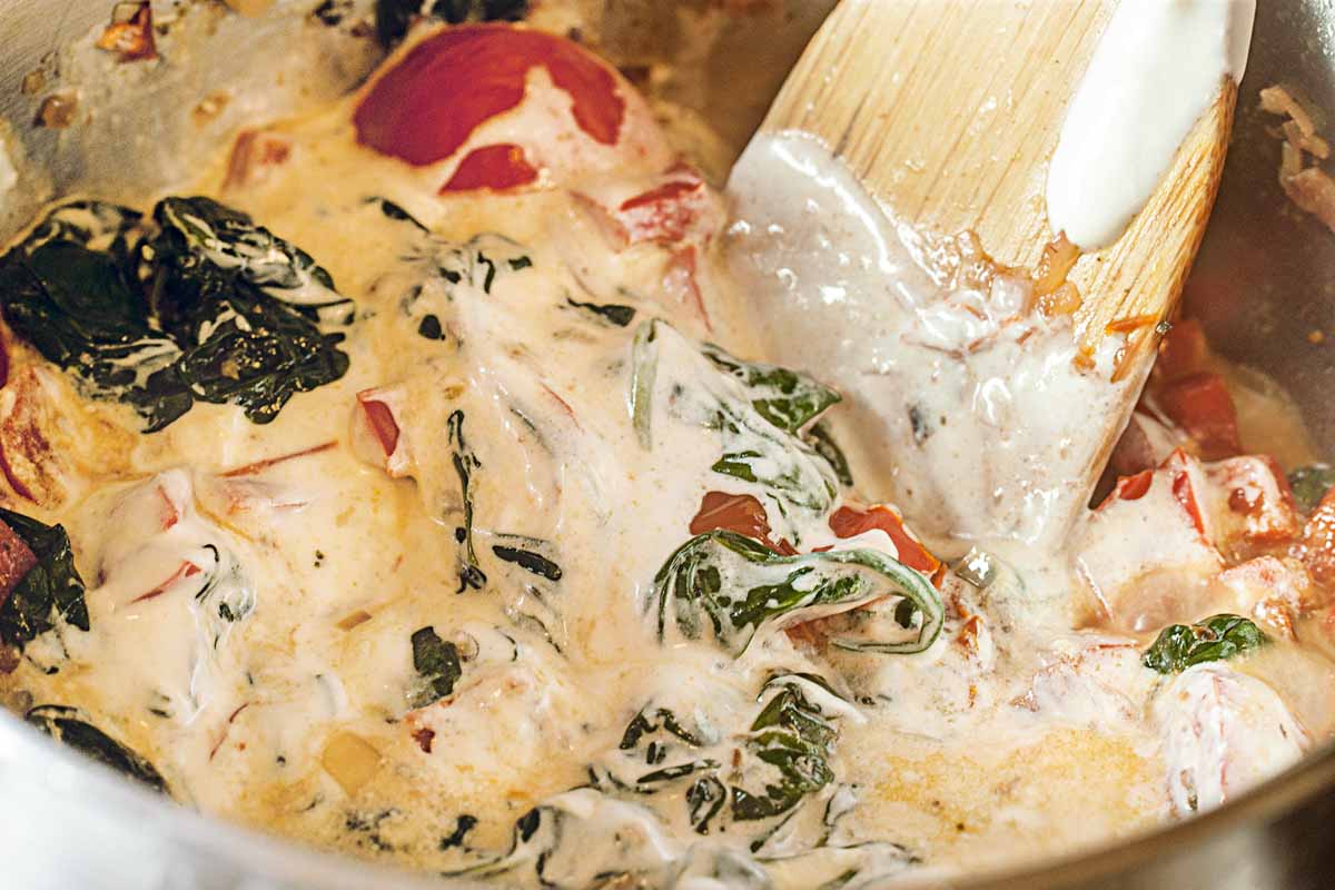 Ist der Spinat angebraten, hebt ihr den Sauerrahm unter (alternativ Sahne oder Schmand).