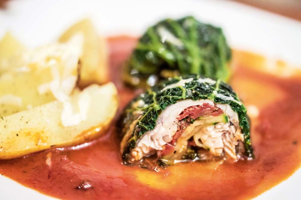 - Pro Roulade ein großes Wirsingblatt (breiter als das Filet) ausbreiten. Den holzigen Strunk entfernen. Dann den Fisch mit getrockneten Tomaten, etwas Salbei, dünnen Zucchinischeiben und Parmesan belegen. Die Wirsing-Seiten einklappen und dann vorsichtig vom Filet-Ende her aufrollen. Das erfordert ein wenig Übung und die richtige Menge an Füllung.