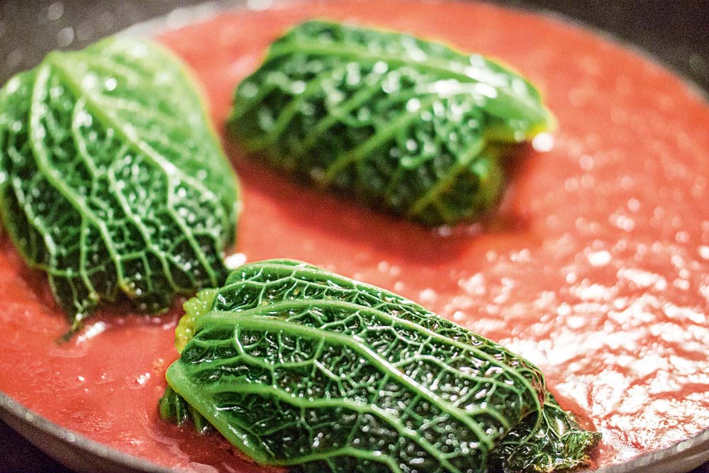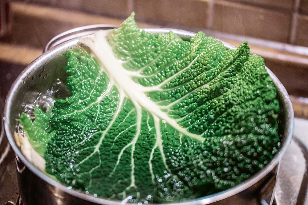 - Die Wirsingkohlblätter etwa 2 Minuten blanchieren und anschließend in kaltem Wasser abschrecken. Durch das Blanchieren lassen sich die Blätter besser formen, ohne dass sie reißen. Das Abkühlen ist wichtig, damit die grüne Farbe erhalten bleibt.