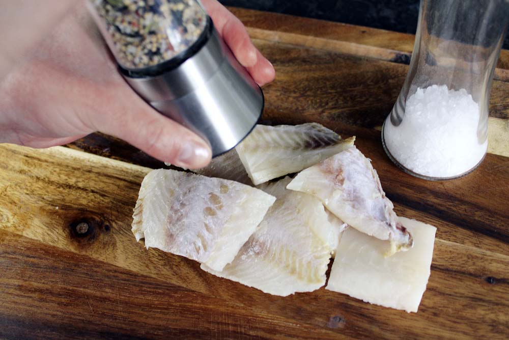 - Fischfilets waschen, trocken tupfen und beidseitig salzen und pfeffern. Gegebenenfalls in kleinere Teile schneiden, um sie später passgenau in die Form platzieren zu können.