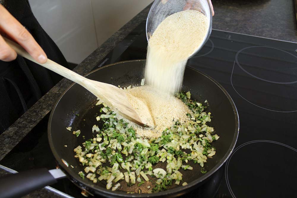 - Knoblauch und Zwiebeln in der Pfanne (im Olivenöl) glasig andünsten. Thymian und Petersilie sowie Semmelbrösel zugeben und alles nochmals kurz erwärmen.