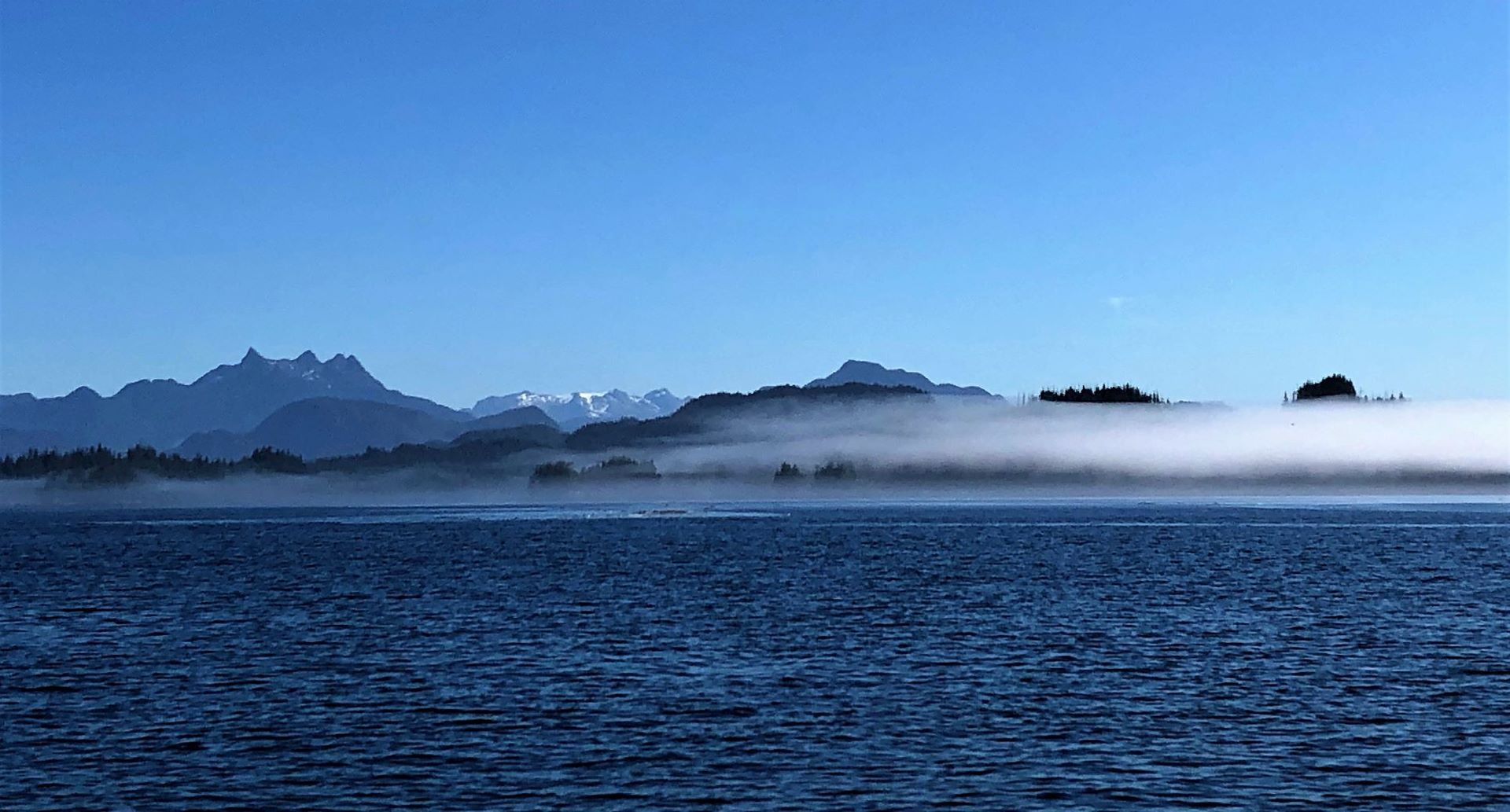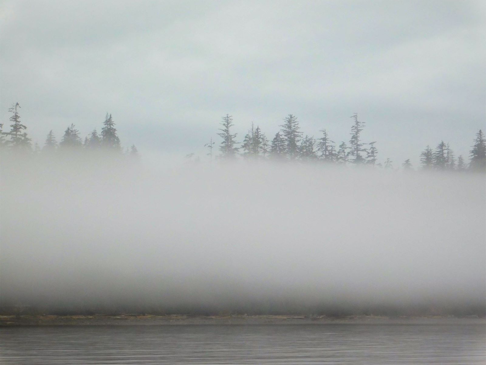 Bis unsere Bekannten Chris, Cam und Fred ca. 9:00 Uhr vorbeikamen, ging nichts mehr. Wir schleppten zusammen weiter bis zum Lizard Point und desponierten dann dort um. Weil das Meer wie ein Ententeich war, wollten wir heute mal bis zum Festland fahren. Dort sollten sich ein paar Cohoschwaerme herumtreiben. Ausserdem konnte man vielleicht mal einen Grizzly am Ufer sehen. Unterwegs wollten wir an der George Bank auf Grundfisch herumdriften. Vielleicht konnte man dort einen Heilbutt oder Ling abfassen. Wir kamen durch Nebelbaenke und Treibgut nach gut 10 Minuten Fahrt an der Untiefe an. Wir montierten die schwereren Geraete auf die Grundraeuber und harrten der Dinge. Die Drift war ohne Wind zu langsam fuer meinen Geschmack. Alexander war jetzt auch wach und pilkte nebenher. Er fing ein paar Felsenbarsche von denen Dave 2 behalten wollte. Aber weder auf unserem Boot noch auf Chris’ Boot wollte etwas Besseres beissen. Wir setzten nochmal um, aber als da auch nichts Vernuenftiges hochkam, zogen wir ein und duesten bis vor das Festland.