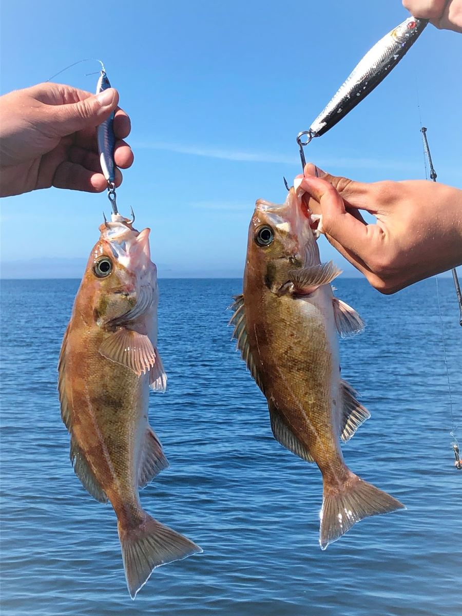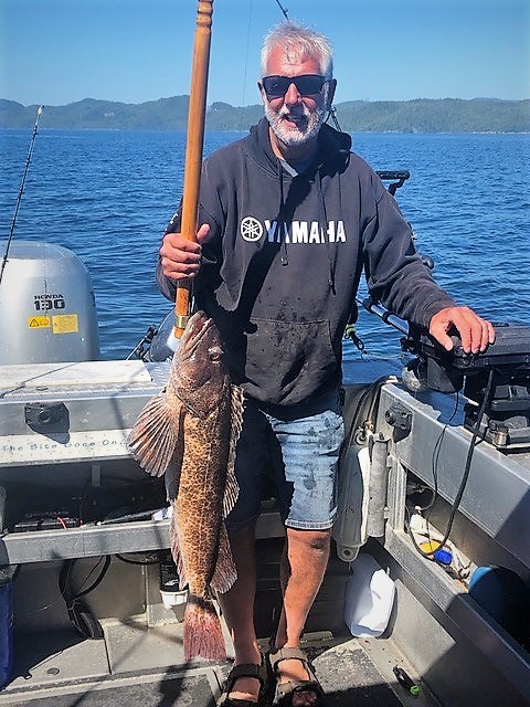 Aber dann fanden die Dornhaie unsere Duftspur und wir hatten alle 3 gut zu tun die hochzukurbeln und wieder abzuhaken. Alex fing doch glatt noch 2 weitere Sablefish die ich auch noch mitnahm um eine Raeucherrutsche mit denen komplett zu machen. Er fing noch mehr aber die liess er alle wieder frei. Auch ein paar Felsenbarsche fanden Interesse an seinem Pilker. Also paar Steine musste es dann da unten doch geben. Ploetzlich stoehnte Alex auf und ich sah seine Rute tief im Wasser verschwinden. Oha, das ist was Richtiges. Er fummelte die Bremse ein bisschen weiter auf und der Fisch riss ein Stueck Schnur ab. Dann sahen wir heftige Schlaege in der Rute – das ist Butt, ganz sicher. Alex fing an zu pumpen, musste aber gleich wieder Schnur lassen. Das war kein Kleiner. Dann ploetzlich war alles weg. So ein Mist aber auch. 50 Pfund Monovorfach durch. Sch….! Alex aergerte sich auch. Er hatte noch gar keinen ordentlichen Fisch gefangen. Das war er gewesen.