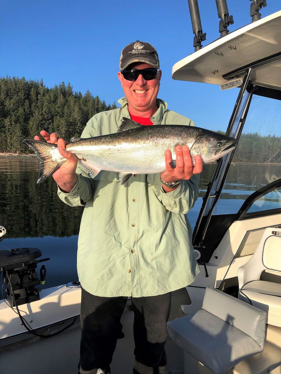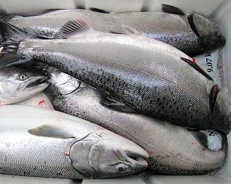 Der Anfang war gemacht. Wir hatten noch einige weitere Bisse und auch Alex fing noch 2 oder 3 Cohos. Leider waren alle bis auf einen sehr kleinen vielleicht 40cm langen Coho unmarkiert und mussten wieder zurueckgesetzt werden. War aber nicht so schlimm fuer uns da die Jungs schon genug Fisch am Stamp behalten hatten und ich hatte eh genug in der Truhe. Dann liessen die Bisse nach und hoerten schliesslich ganz auf. Ich fuhr uns ins flachere Wasser und wieder ins tiefe, aber die Cohos waren ploetzlich nicht mehr da oder uninteressiert an unseren Koedern. Ich welchselte die Koeder durch aber es blieb erstmal bei einer spassigen und meist sonnigen Bootstour.
