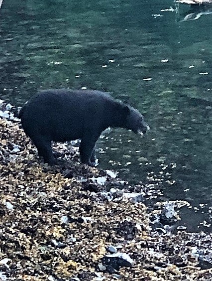 Waehrend Dave nun den Coho entsorgte, war ich bemueht den Drilling aus meinem Finger herauszukriegen. Ich habe schon einige Angelhaken in meinem Leben in verschiedensten Koerperteilen gehabt, aber das war wohl der am tiefsten sitzende und einer der schmerzvollsten. So ein kleiner Finger hat wirklich nicht viel Fleisch – die Hakenspitze musste schon auf dem Knochen herumkratzen. Brrrrr Jetzt war ich froh wegen der Bestimmung, dass man Schonhaken zum Lachsangeln benutzen muss. Aber selbst ein angedrueckter Widerhaken kommt nicht allzuleicht aus einem Finger wieder heraus. Es bedurfte eines mutigen und kraeftigen Ruck mit der Zange und dann war ich frei. Endlich. Das Blut schoss heraus und spuelte wohl alle Keime mit heraus denn das Ganze hatte keinerlei Nachspiel. Na, der Coho war hart verdient! Dave verlor noch einen der selben Kategorie kurz vor dem Boot und dann war die Beisszeit vorbei. Fuer mich hatte sie gar nicht erst angefangen. Komisch. Wir versuchten es noch eine Weile und schauten immer wieder nach Baeren am Ufer aus. Und tatsaechlich, in einer Bucht kam zwar kein Grizzly aber ein grosser Schwarzbaer aus dem Dickicht und suchte das Ufer nach Fressbarem ab.