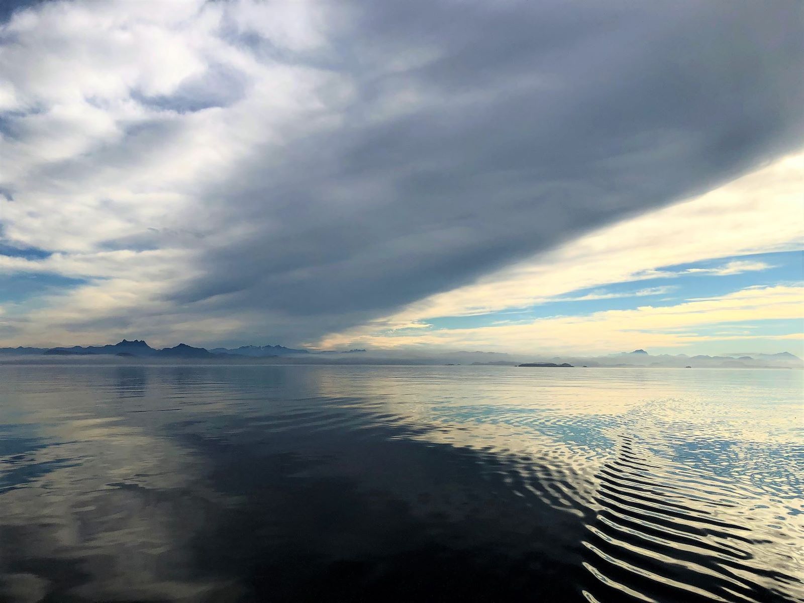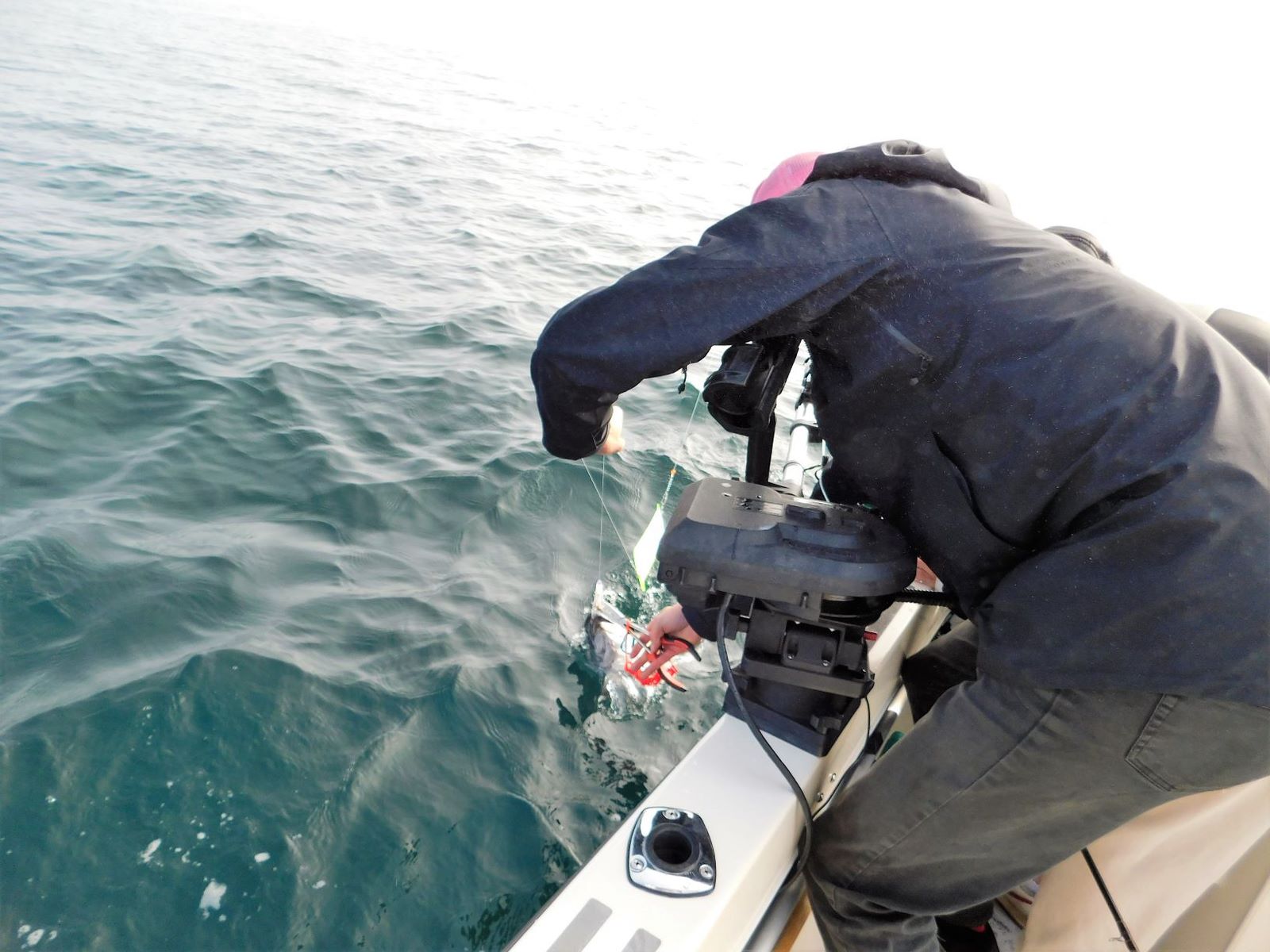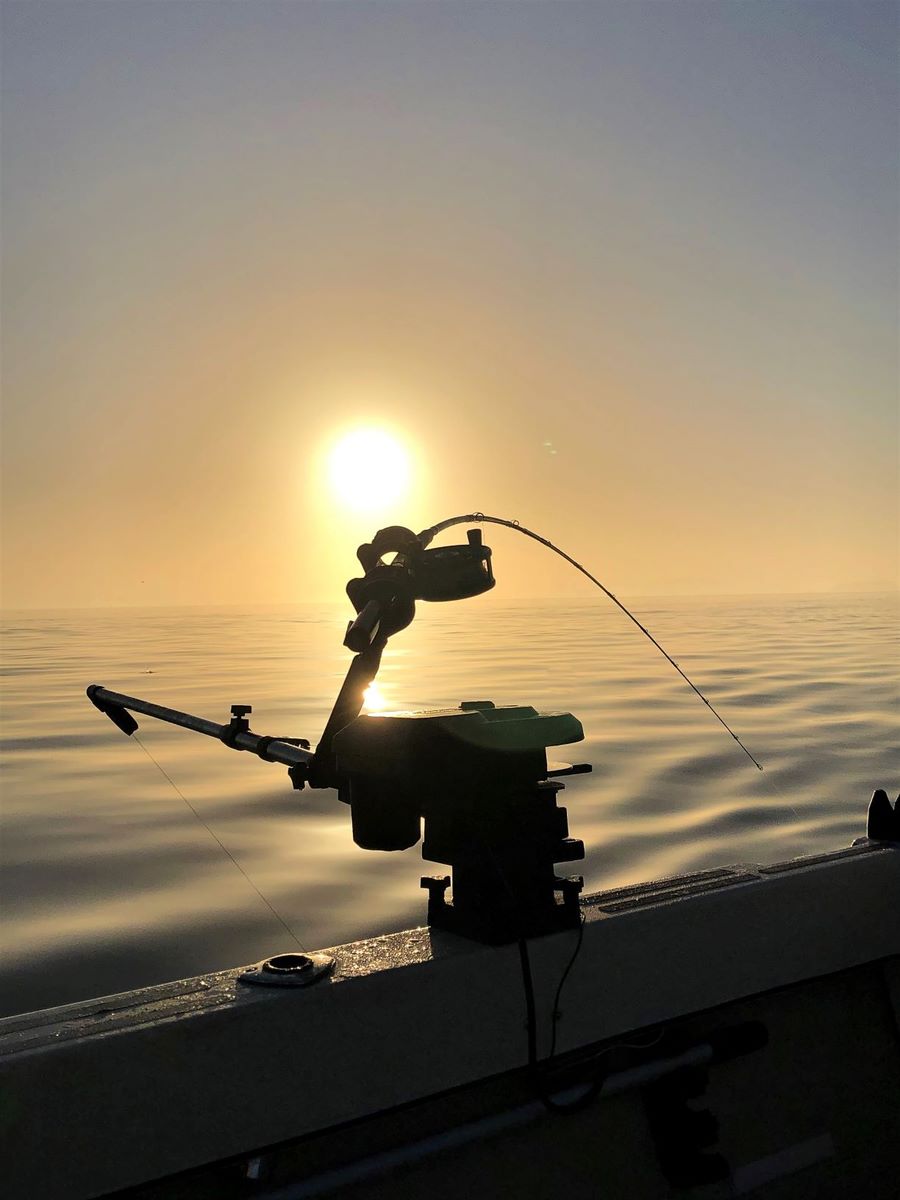 Tag 4 und wieder absolute Windstille. Heute waren wir alleine und wollten nochmal eine gute morgendliche Lachsschicht einlegen. Jetzt wo wir den Tiefentrick heraus hatten; oder dachten so. Lachse auf ihrer Heimreise bleiben nicht lange an einer Stelle. Daher ist oft die heisse Fangstelle von gestern am naechsten Tag verlassen. Bis ein neuer Schwarm ankommt. Daher wollten wir unsere Lachsruten schon ein bisschen weiter suedlich vom Black Bluff einsetzen. Vielleicht waren die gestrigen Black Bluff Lachse heute schon am Lizard Point.