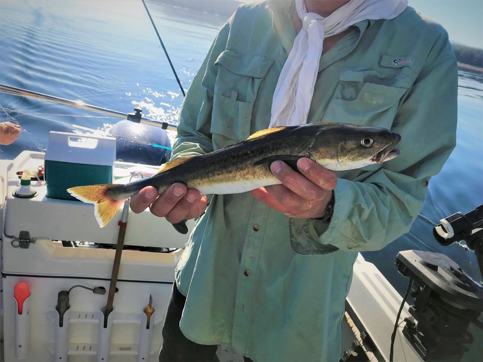 Wir konnten nichts im Flachen erwischen und so konzentrierten wir unsere Anstrengungen auf der tieferen Seite. Dave und ich liessen unsere Koeder nun dicht am Boden langschleifen. Aber es war meine Rute die als naechste wieder losruckte. Wieder ein sportlicher Gegner und ich hatte einen Heidenspass am Drill. Dave kescherte meinen Fisch kopfschuettelnd und leicht verzweifelt. Er mass meine Vorfachlaenge exakt ab und inspizierte meine Koedermontage unter der Lupe. Chris meldete Bissstille auf seinem Boot. Ich riet ihm die tiefe Variante und bald vermeldeten sie auch wieder Bisse. Es war schon komisch, dass die Fische heute hier nur so tief bissen. Ich hatte hier schon etliche Male geangelt und immer hatten wir die Fische flacher gefangen. Hm. Ich versuchte Alexander aufzuwecken um auch ihn mal an einen ordentlichen Fisch zu bringen aber er drehte sich nur knurrend um in der Koje. Ok, ich hab’s versucht.