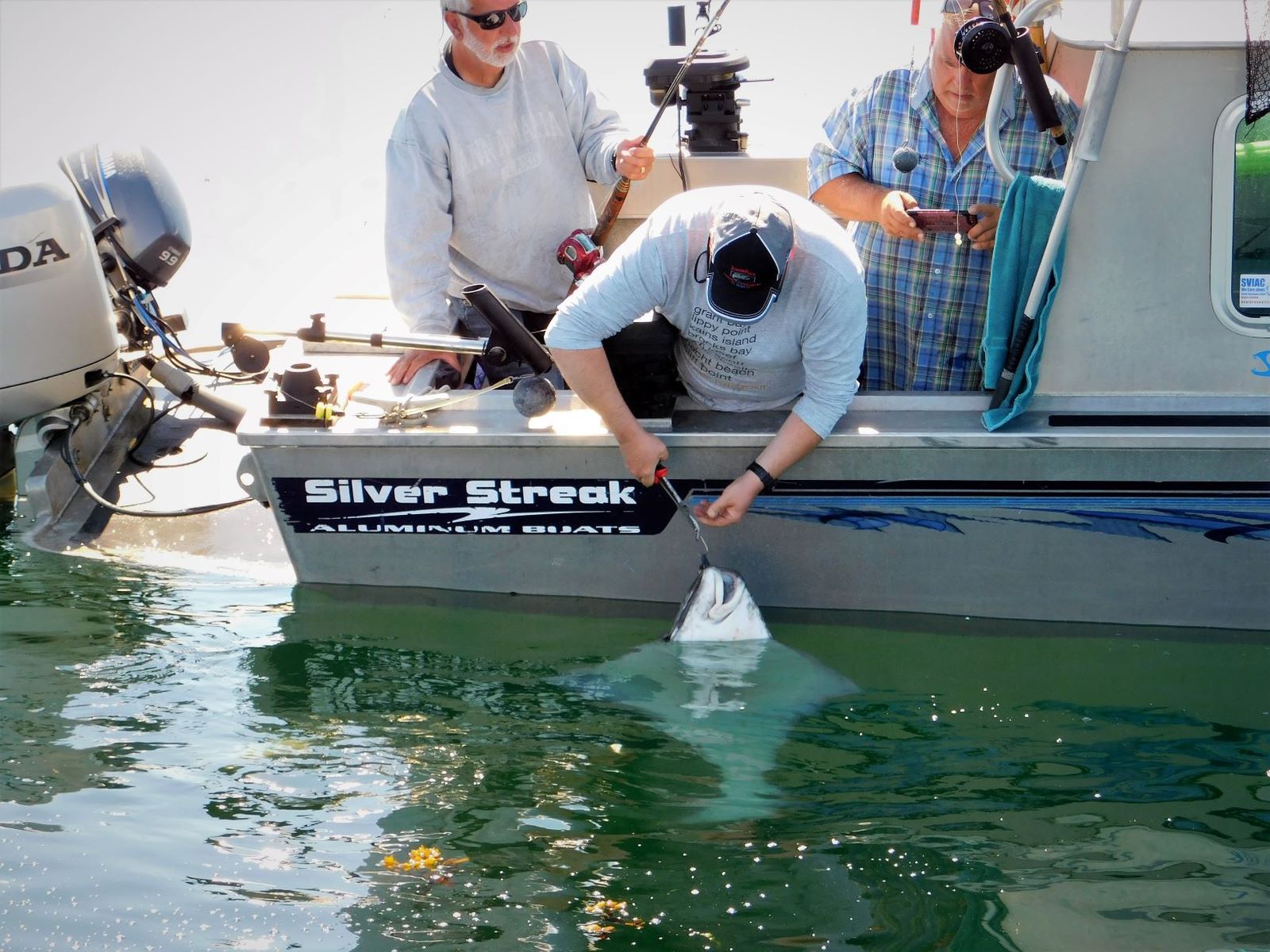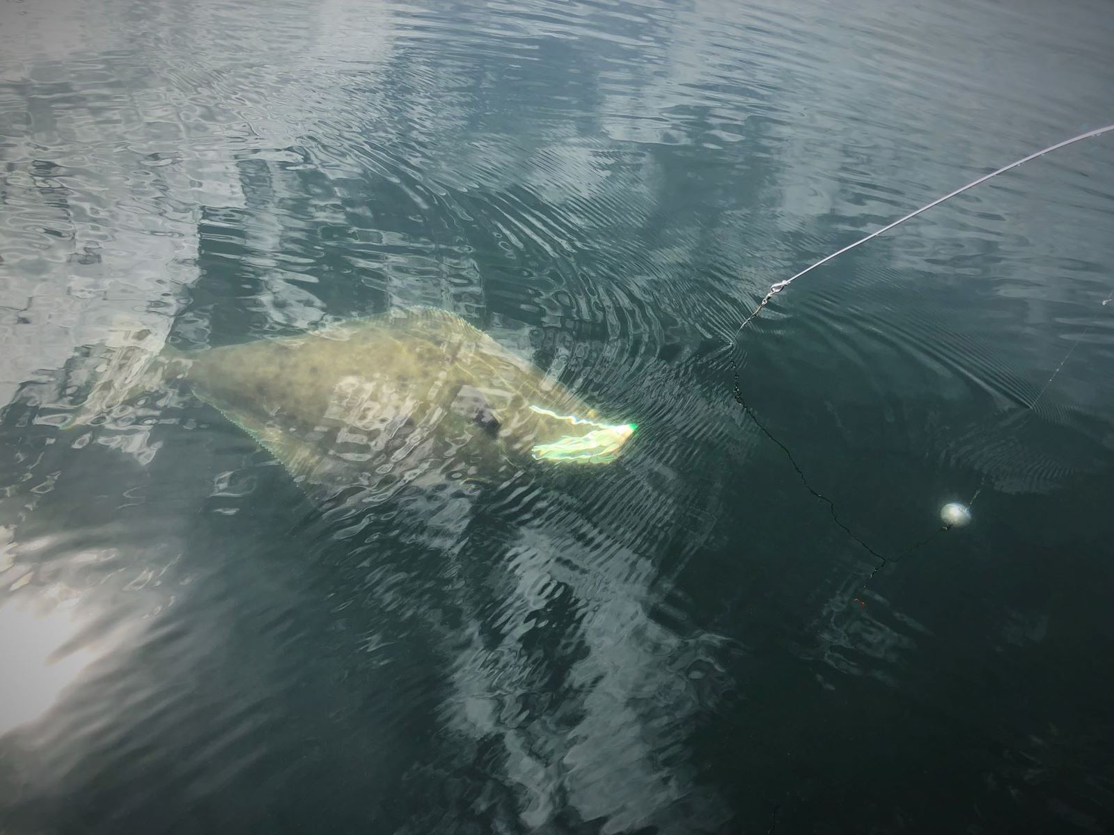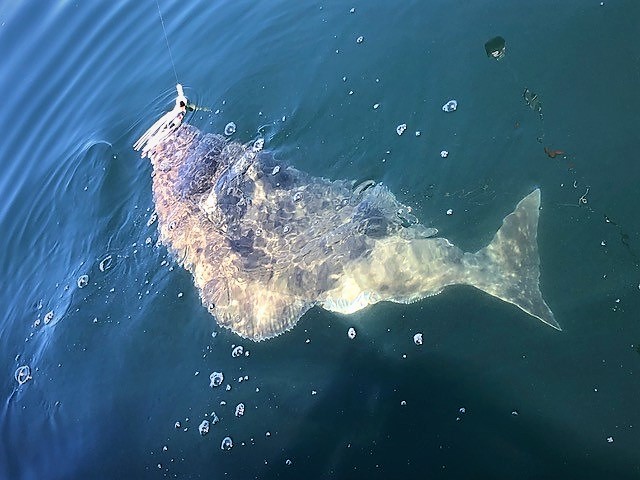 Wir drifteten kreuz und quer aber konnten nichts als kleine Barsche finden. Chris funkte, dass sie einen guten Ling im Boot und ein Monster im Moment an der Leine hatten. Chris war keiner der gross uebertrieb. Das wollten wir uns aus der Naehe mal ansehen und wir holten ein und fuhren zu ihnen. Dort sahen wir Fred mit seiner stark gekruemmten Rute stehen und Cam schon die Kamera bereithalten. Wir sahen mit an wie ein grosser Schwall an der Oberflaeche auftauchte was gleich von lauten Rufen begleitet wurde. Ich fuhr uns noch naeher ran und jetzt konnten wir die Monsterplatte sehen. Wow! Was fuer ein Scheunentor. In dem Moment musste sich der Fisch erschreckt haben denn Fred’s Rollenbremse heulte auf und Fred stoehnte dazu. Er brauchte mehrere Minuten um den Fisch wieder an die Oberflaeche zu pumpen. Wir warteten wieder alle gebannt. Da war er wieder. Der war ueber 100 Pfund. Zu gross zum Behalten; das Maximalmass war 133 cm dieses Jahr. Wir alle schossen ein paar Fotos von dem gewaltigen Fisch waehrend Chris den Haken entfernte und die Platte wieder in die Tiefe entliess. Was fuer ein Fisch!