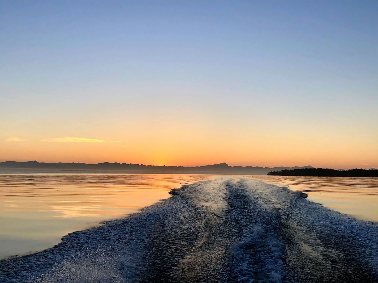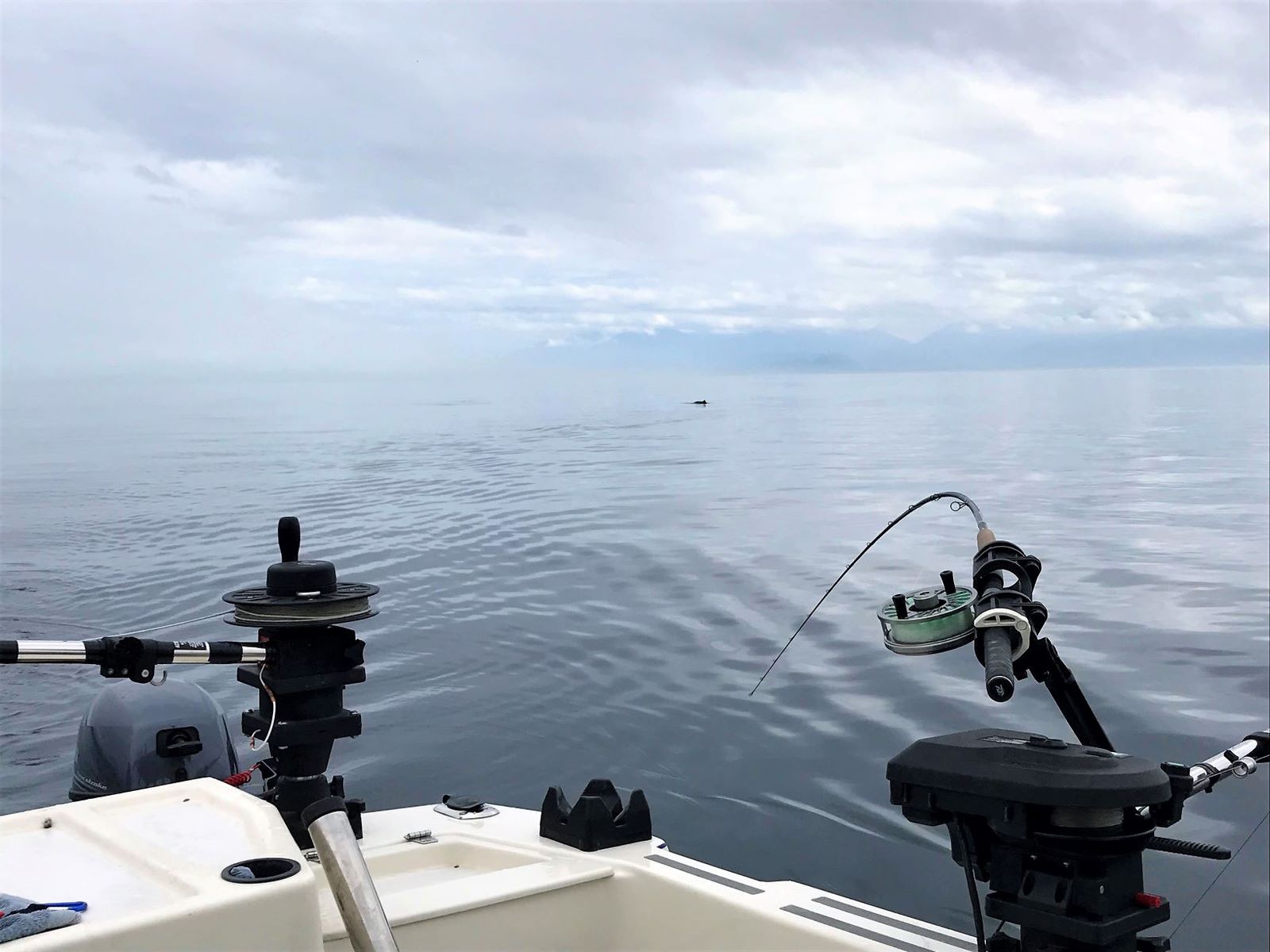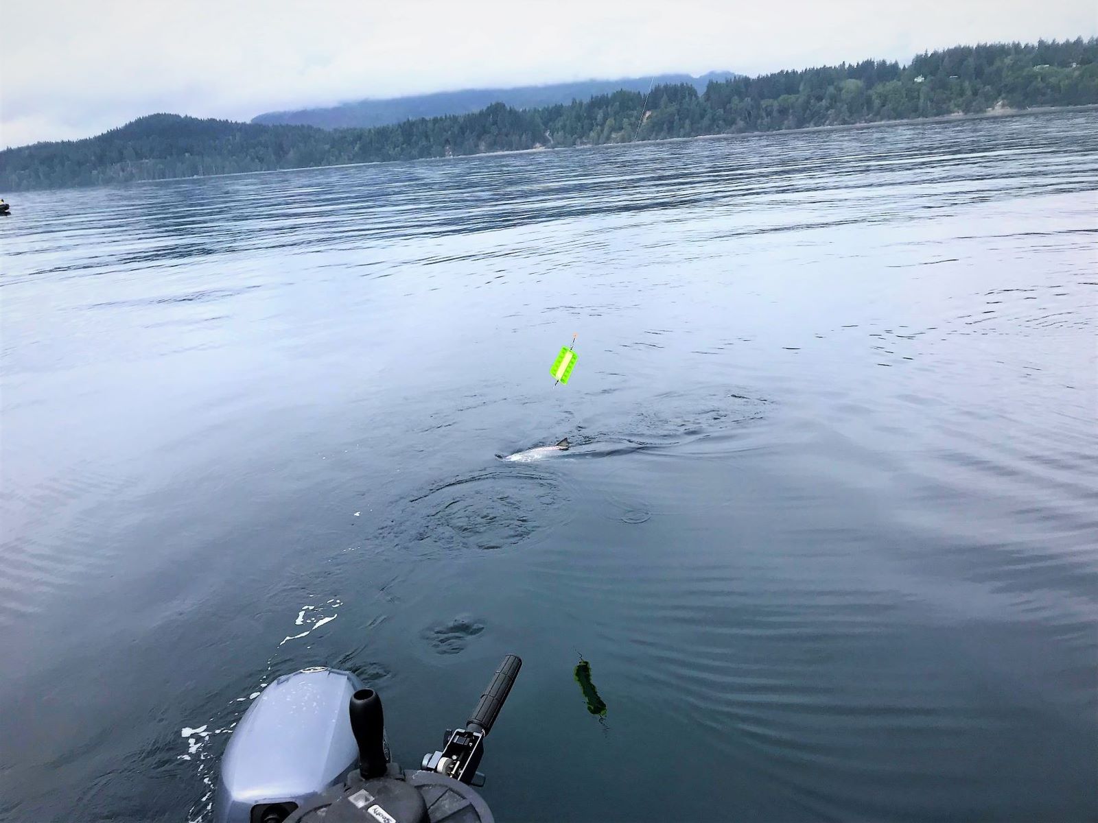Vor eineinhalb Wochen kribbelte mich Mittwoch abends so ein Gefuehl. Die Berichte von anderen Anglern vor Sooke waren gemischt; ein paar Tage zuvor hatte es gerappelt, dann folgte wieder eine Ruhepause – was typisch ist fuer Wanderfische. Die sind heute hier und morgen dort und die Fischerei bleibt selten mal mehr als ein paar Tage konstant. Ich schaute mir die Gezeiten an – aber daher konnte mein Bauchgefuehl eigentlich nicht stammen: es ebbte den ganzen Morgen. Da fischt man die Kehrstroemungen wo man hofft, dass die Fische bis zur naechsten Flut ausharren, die sie dann weiter Richtung Heimatfluss bringt. Bei Flut auf Lachs angeln ist immer vielversprechender da man sich auf dem Lachshighway platzieren und warten kann, bis die Lachse vorbeiziehen – wenn sie denn da sind.