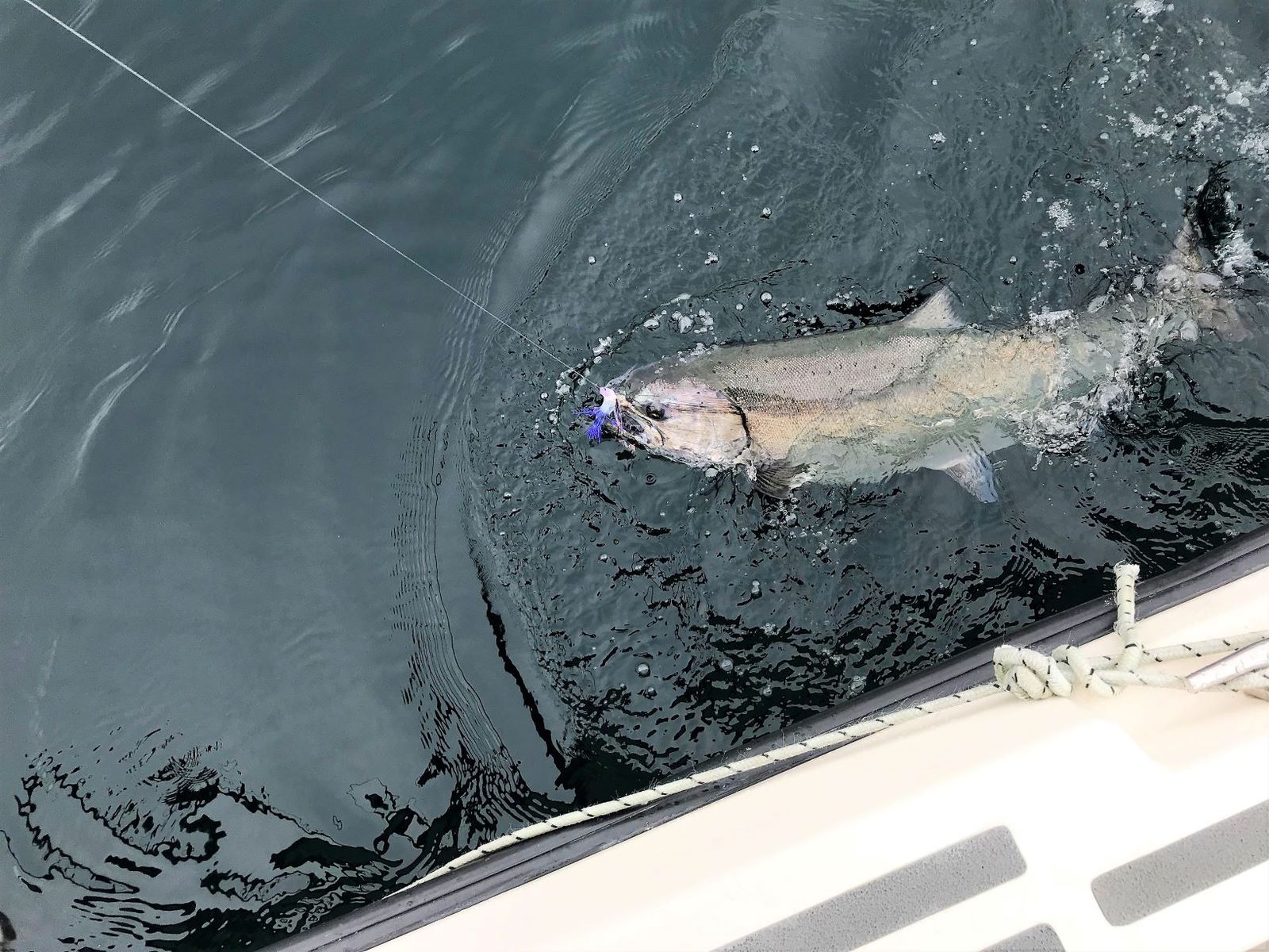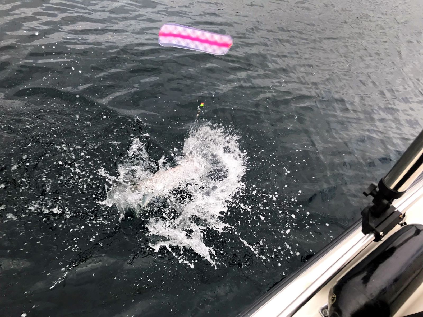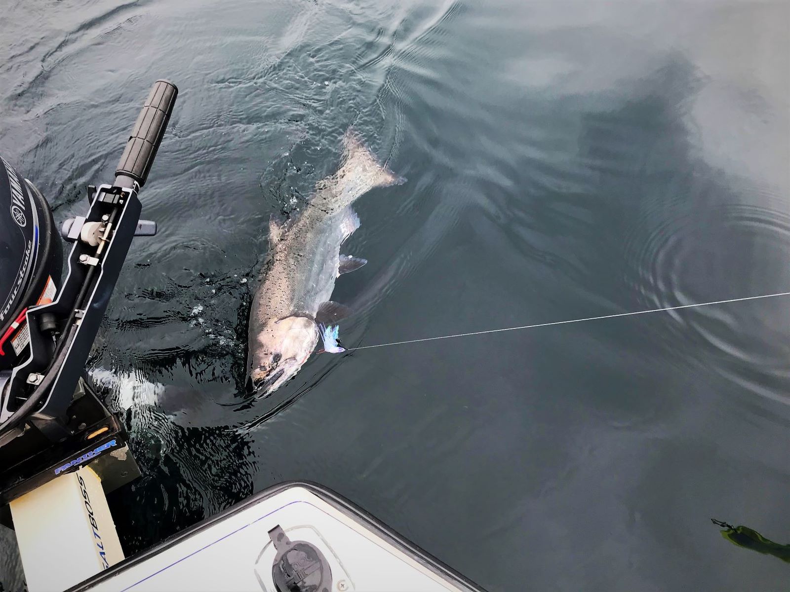 Waehrend der Fisch noch rannte, drehte ich den Motor runter und drehte nach backbord Richtung Aussenseite ab. Das Boot direkt hinter mir steuerte scharf in die andere Richtung und die Flotte auf der Aussenspur liess mich ohne Probleme durch. Fantastisch! Ich blieb dem Fisch auf den Fersen um keine grosse Distanz zwischen uns kommen zu lassen. Die meisten Ueberfahrunfaelle beim Trolling passieren wenn die anderen Boote keine Ahnung haben, dass Dein Fisch ein paar hundert Meter weg herumkreist. Man sollte moeglichst dicht dran bleiben, dann war die Gefahr abgeschnitten zu werden am geringsten. Der Lach kam nun naeher ans Boot und wir sahen ihn das erste Mal. Ein praechtiger Bursche – ueber 20 Pfund mit Sicherheit.