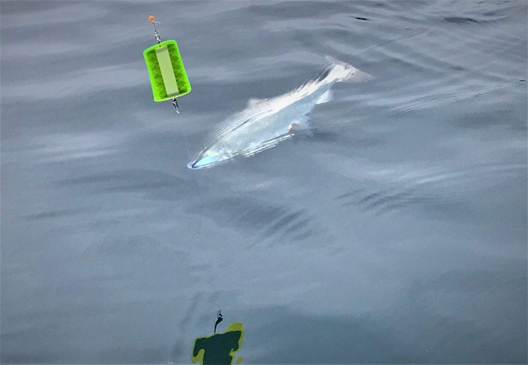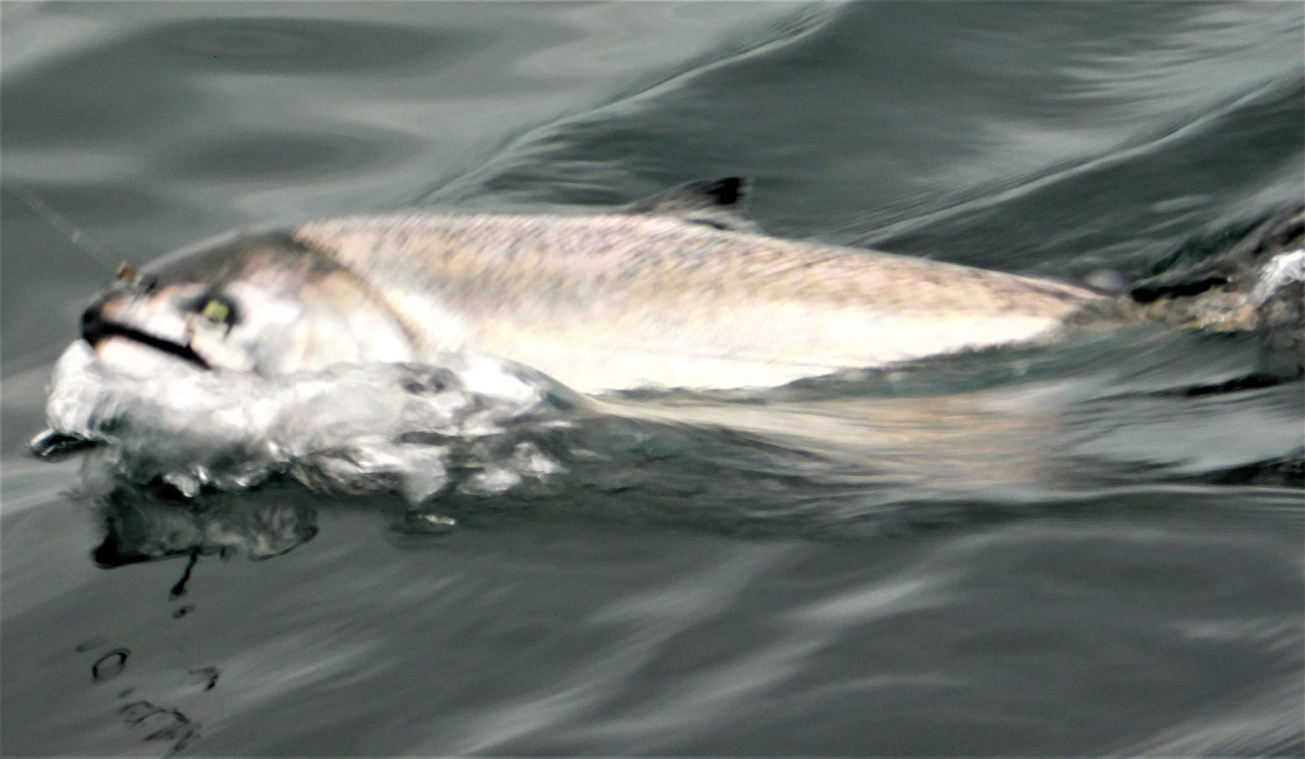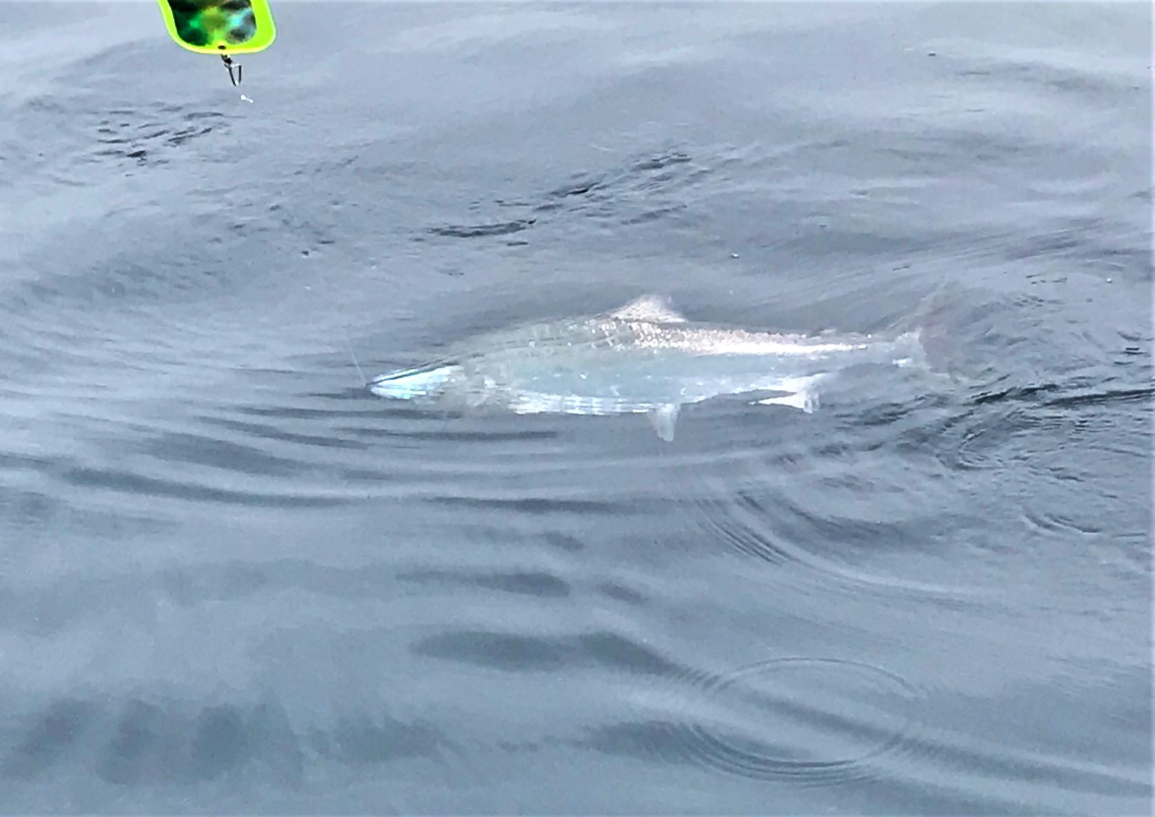 Waehrend der Fisch noch rannte, drehte ich den Motor runter und drehte nach backbord Richtung Aussenseite ab. Das Boot direkt hinter mir steuerte scharf in die andere Richtung und die Flotte auf der Aussenspur liess mich ohne Probleme durch. Fantastisch! Ich blieb dem Fisch auf den Fersen um keine grosse Distanz zwischen uns kommen zu lassen. Die meisten Ueberfahrunfaelle beim Trolling passieren wenn die anderen Boote keine Ahnung haben, dass Dein Fisch ein paar hundert Meter weg herumkreist. Man sollte moeglichst dicht dran bleiben, dann war die Gefahr abgeschnitten zu werden am geringsten. Der Lach kam nun naeher ans Boot und wir sahen ihn das erste Mal. Ein praechtiger Bursche – ueber 20 Pfund mit Sicherheit.