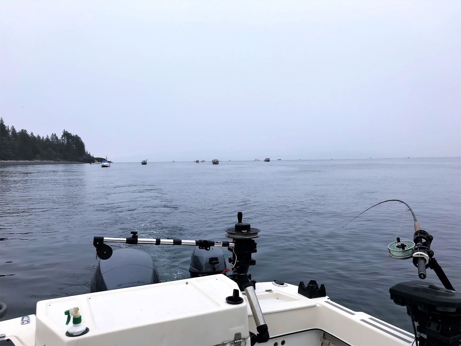 Damit konnte ich dann heute hoechstens noch markierte Cohos oder Pinks behalten. Nun gut. Nachdem ich den Fisch versorgt hatte, vollendete ich meine Otter Point Schleife, entschied dann aber diese Tour nicht nochmal zu wiederholen sondern die Stelle zu wechseln. Ich sah das weiter westlich am Muir Creek nur wenig Boote waren und dass das mir einen wesentlich entspannteres Angeln bringen wuerde. Auch wenn es schwer ist eine produktive Stelle so schnell zu verlassen; Otter Point und Muir Creek waren dicht beieinander und wenn Otter Point lief, ging meistens auch was am Muir Creek. Und beide Stellen waren auch bei Ebbe faengig.