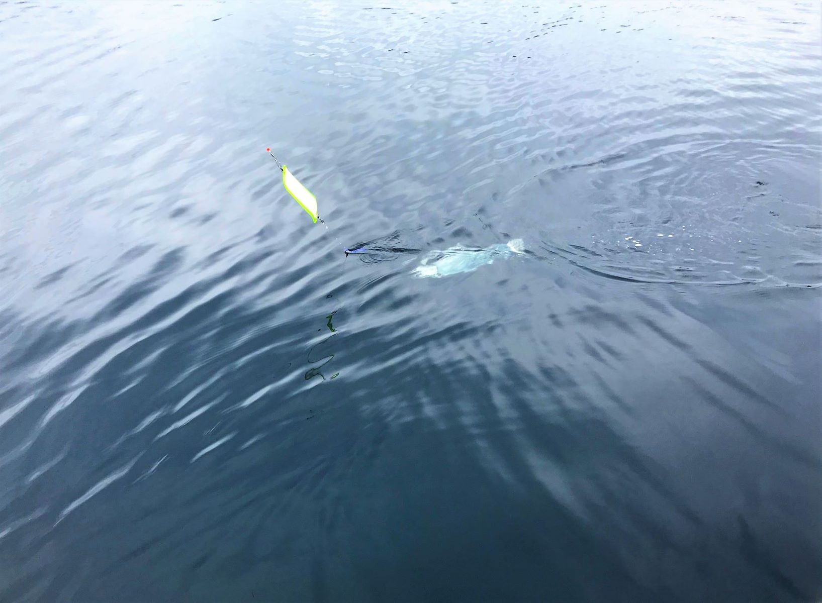 Wir montierten zwei Koederfischruten und schleppten die ersten Paesse dicht vor dem Kelpguertel entlang. Es schien kein Lachs hier flach zu rauben. Die Ruecktour zum Ausgangspunkt fuhr ich etwas weiter draussen wo es schon 40m tief war. Bei der zweiten Ruecktour liess ich meinen Koederfisch mal ganz bis zum Boden runter. Ich setzte mich gerade wieder hin als meine Rutenspitze wild zu rucken anfing. Ich sprang hin und schlug an. Der sitzt! Ein ordentlicher Widerstand machte sich am anderen Ende der Schnur bemerkbar. Aber er wollte nicht abziehen. Hm, hatte ich vielleicht einen Kleinen foul-gehakt? Oder ein Butt? Ein paar schwere Kopfstoesse liessen mich weiter hoffen. Dave holte schnell seine Rute ein, beide Downrigger und verlangsamte die Fahrt. Jetzt zog ich meinen Widersacher Stueck fuer Stueck heran. Hin und wieder schien es mal als ob er ausbuechsen wollte aber dann kam nichts mehr. Sehr komisch. Dann kam er ca. 30m hinter dem Boot an die Oberflaeche. Oja, da war was Groesseres dran – es schob eine ordentliche Bugwelle.