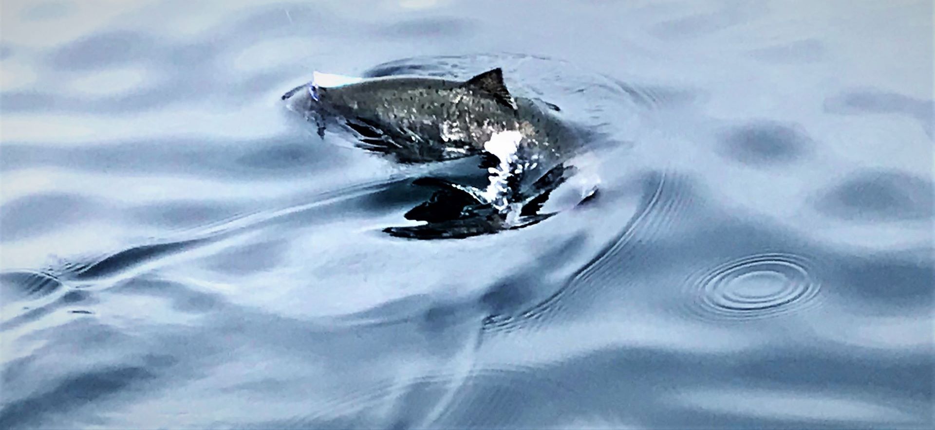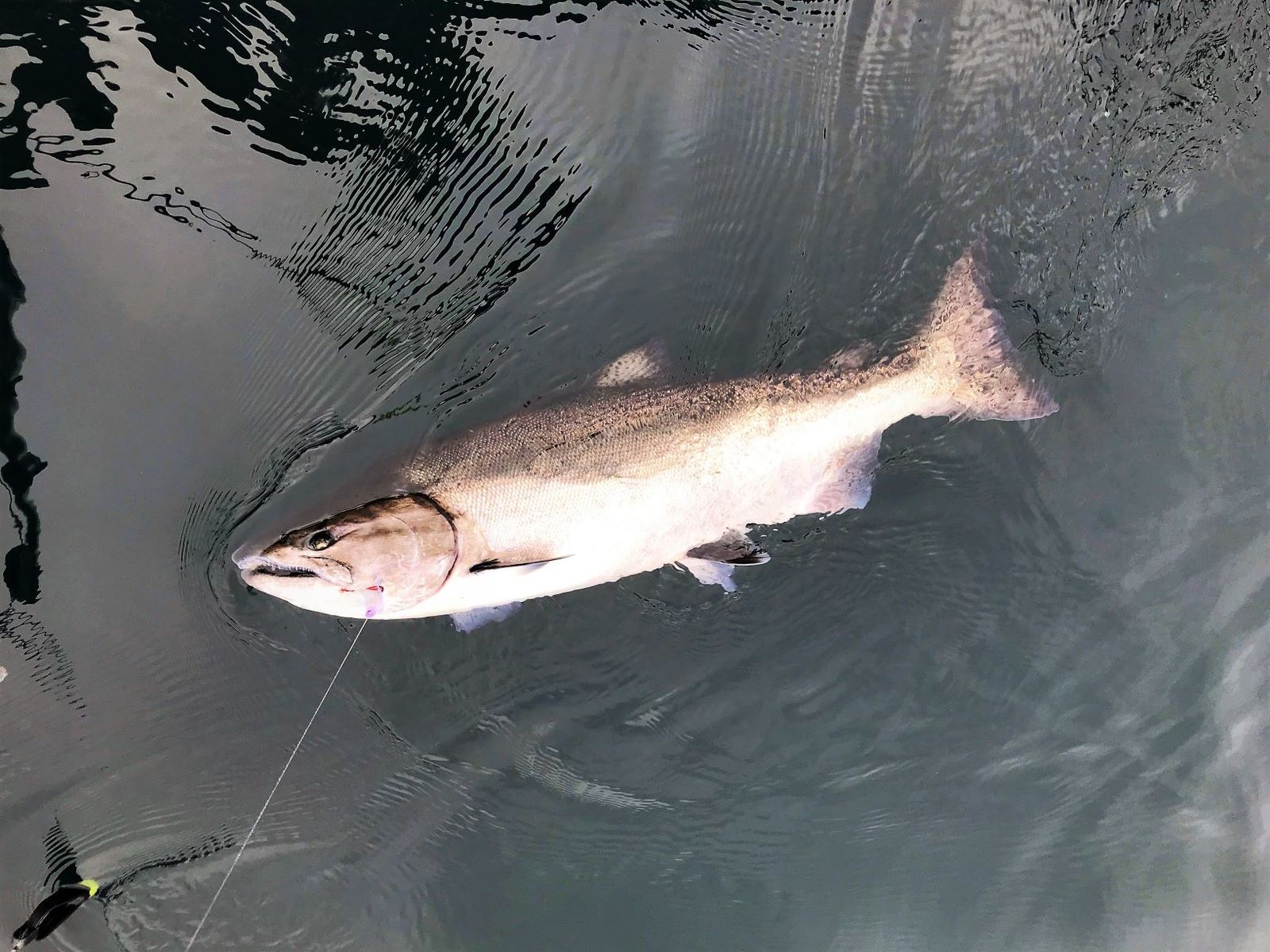 Wir waren halb die Schleife am Ufer entlang durch, da sah ich die Flash Fly Rute ausloesten und wild herumrucken. Aha, das ging ja schnell! Ich nahm die Drehzahlfernsteuerung mit mir mit ans Heck wo ich auch das zweite Steuerrad hatte. Von hier konnte ich jetzt bequehm den Fisch drillen und das Boot auf Kurs halten. Mit wurde bald klar, dass das kein grosser Chinook war und ich keine lange Fluchten zu erwarten hatte. So blieb ich in der Bootsschlange und fuhr den Kurs weiter, wenn auch etwas langsamer um mir den Drill etwas einfacher zu machen. Der Fisch wehrte sich ordentlich und lieferte an der Oberflaeche ein richtiges Spektakel ab. Ich tippet schnell auf Coho und lag auch richtig damit. Fuer einen Coho war dieser etwa 7 pfuendige Fisch nicht schlecht aber ich wollte heute eh keinen Fisch toeten es sei denn es waere ein markierter Chinook – um den Kopf und Chip zur Auswertung einzureichen. Der hier war ein unmarkierter Coho und musste eh wieder freigelassen werden. Ich hakte ihn gleich am Boot im Wasser wieder ab. Gut, feiner Anfang!