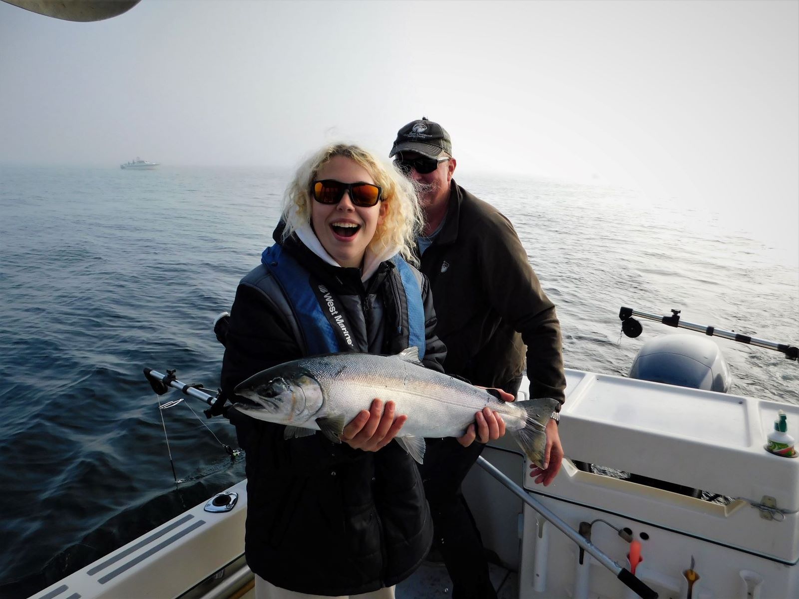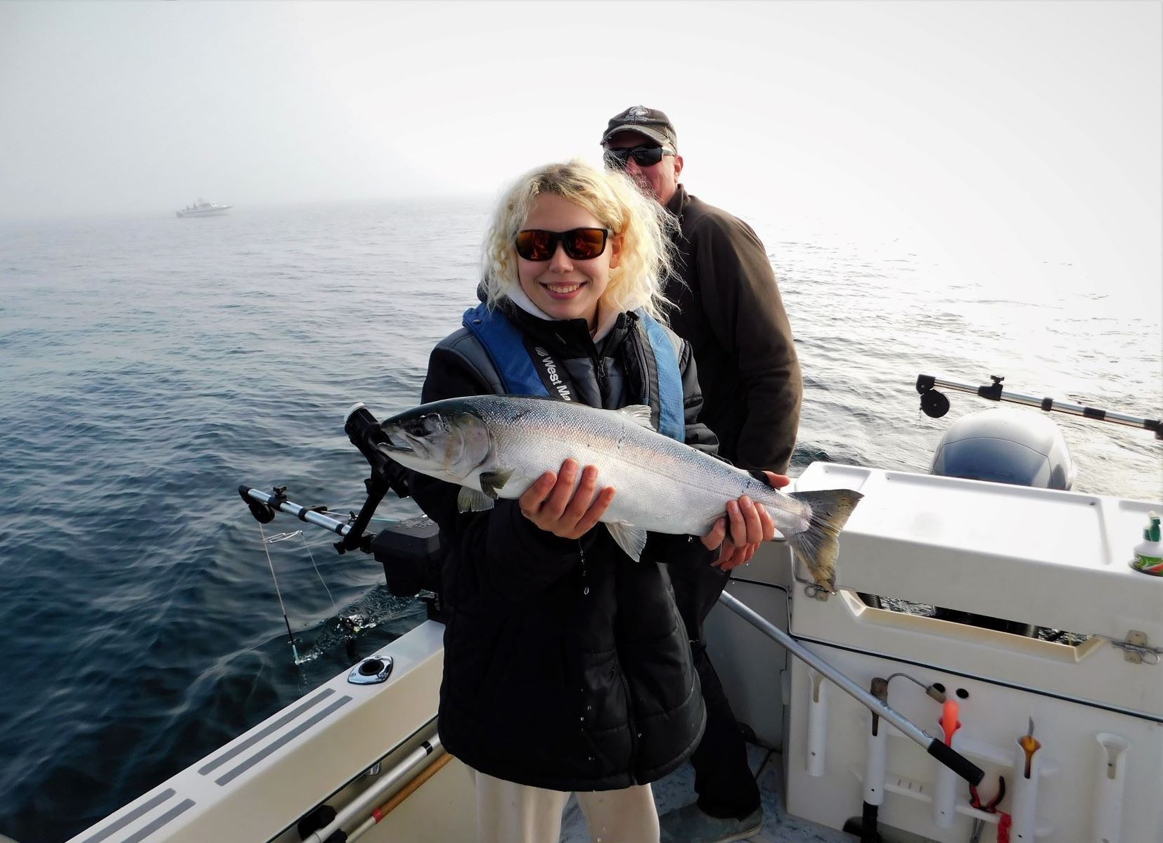 Paar Minuten spaeter der naechste Biss und diesmal kam ein feister aber leider wilder Coho zum Boot. Da das Emma’s groesster gefangener Fisch bisher war, holten wir ihn kurz fuer ein Foto raus. Dann ging er wieder ins Meer zurueck. Es biss jetzt in 15 minuetigen Abstaenden. Die beiden hatten einen Spass dabei – da freute sich das Vaterherz! Einen Lachs wollte ich noch gerne fuer die Raeuchertonne haben. Als die beiden einen mittelpraechtigen Pink ans Boot gedrillt hatten, dachte ich noch ich warte besser auf einen mittleren markierten Chinook. Nach der Donnerstag-Chinook-Show wuerden wir doch wohl ein oder zwei Chinooks erwischen heute, dachte ich. So liessen wir auch den Pink wieder frei. Dann kamen noch ein oder zwei wilde Cohos dazu und ein paar verpasste Bisse. Alles in allem eine kurzweilige Angelei in den ersten eineinhalb Stunden.
