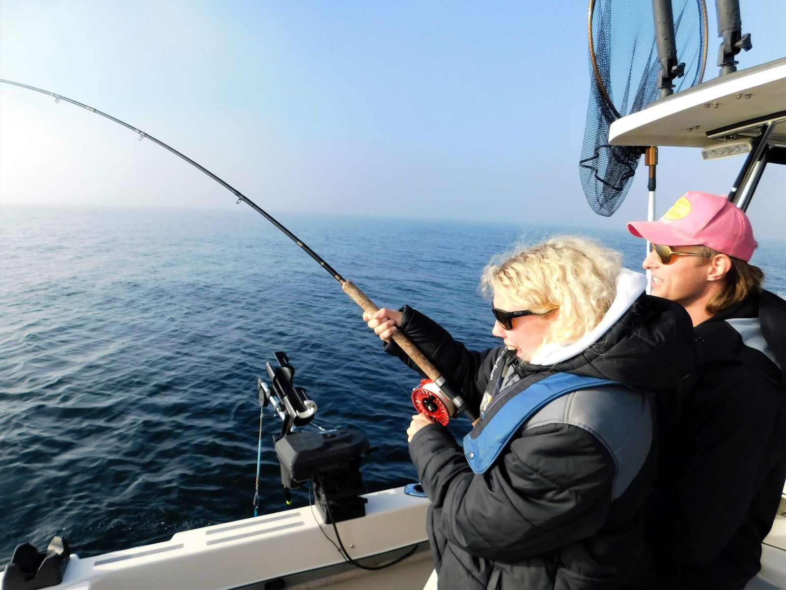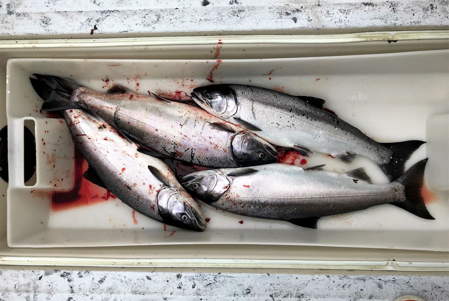 Um 16:00 Uhr machten wir Schluss. Es hatte nicht ganz zu unserem Maximallimit gereicht weil wir nur wenige markierte Cohos fanden. Aber immerhin hatten wir am Ende 2 unmarkierte und 4 markierte Fische in der Kiste. Alles in allem mussten wir so um die 30 Cohos ans Boot gedrillt haben und noch etliche wurden im Drill verloren. Ein voller Erfolg unter Sommerbedingungen im Oktober.