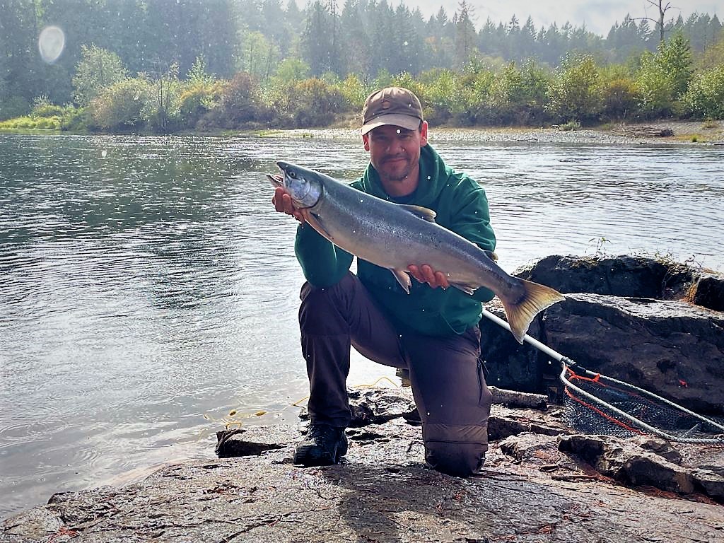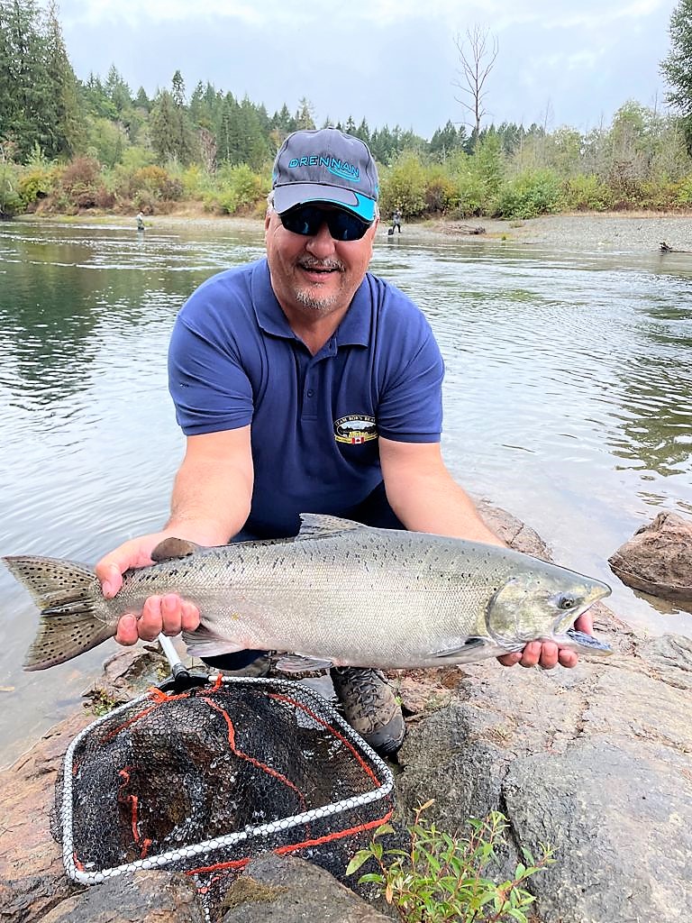 Ich fragte meine Frau ob sie die zweite Rute mal schnell einholen koennte, damit ich mehr Spielraum bei der Landung haette. Nach einiger Konfusion wieherum man denn die Rolle bediente, funktonierte das auch. Jetzt hatte ich beide Seiten frei zur Landung. Waehrend der Fisch um und hinter dem Boot herumsausste, sah ich schon die Fettflosse am Fisch. War also kein Markierter und daher wollte ich ihn wieder freilassen. Aber ein kurzes Foto wollte ich haben! Der Fisch liess sich einigermassen gut in den Kescher bugsieren; der Haken flog dabei schon selber heraus – ich musste ihn nur kurz aus dem Keschernetz fummeln. Dann hob ich den feinen Chinook kurz fuer ein Foto mit den Haenden aus dem Kescher im Wasser und keine 10 Sekunden spaeter sausste er wieder in die Tiefe. Feine Sache! Wir klatschten uns ab und machte das Geschirr gleich wieder klar.