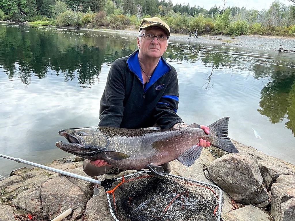 Ich sah den Burschen dann bald – der hatte um die 10 Pfund. Der Haken hing gut im Maulwinkel und dieser Fisch waere ein guter Release-Kandidat gewesen. Allerdings sah ich auch, dass die Fettflosse fehlte. Das war also ein Lachs aus einer Brut-und Aufzuchtsstation. Und da wir lokalen Angler das Sooke Chinook Net Pen Projekt unterhielten, wollten wir gerne wissen, wieviele von unseren vor 3-4 Jahren ausgesetzten Lachsen ueberlebt haben. Dafuer mussten wir markierte Chinooks toeten und die Koepfe zum Ministerium einreichen (jede Marina hat eine Kuehltruhe dafuer bereitstehen). Also fuer die Wissenschaft musste dann dieser erste Chinook heute dran glauben.
