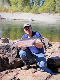 So schlugen Peter, Alex, Matze und Markus hier auf der Insel auf und fischten sich schon mal heiss am Stamp River bei Port Alberni. Sie sind dort schon alte Fuechse und zum Xten Mal da. Ueber ihre Faenge im Fluss staunten sogar die Einheimischen. Sie hatten auch Glueck, dass kurz vor ihrer Ankunft ein bisschen Regen kam und die Lachse zum Aufstieg motivierte. Ich glaube sie haben nichts dagegen wenn ich hier mal ein paar ihrer tollen Fangfotos einstelle obwohl ich keine Autorenrechte dazu habe. Am Freitagabend kamen dann Markus, Matze und Alex zu mir um am Samstag mal einen Tag beim Meeresfischen zu verbringen. Wir hatten einen lustigen und bierhaltigen Abend zusammen und tauschten tausende Erfahrungen und Fischstories von Deutschland, ueber Norwegen und bis nach Kanada aus. Ich legte schon mal Lachs und Heilbutt auf den Grill fuer den Fall das wir nichts fangen wuerden, so haetten wir wenigstens schon mal Fisch gegessen!