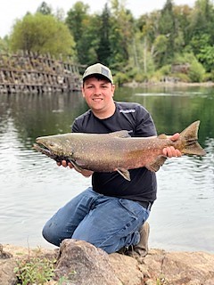 Und ab da rappelte es paar Mal richtig gut. Wir erwischten vielleicht 5 oder 6 Cohos in der 5-7 Pfundklasse. Leider waren alle unmarkiert und die derzeitigen Regeln (ab 1.10.) erlaubten uns nur einen unmarkierten pro Lizenz. Dafuer konnten wir aber noch 3 Markierte pro Lizenz behalten; aber diese Nadeln im Heuhaufen musste man erstmal finden! Dave behielt den Groessten der unmarkierten; nur mal so um den Anfang zu machen. Ich wartete noch auf einen Groesseren. Da sollte doch mal einer um die 10 Pfund kommen! Durch das Funkgeraet hoerten wir die Updates von den Derbyteilnehmern – da fuehrte ein 11,5 Pfund Coho. Sowas haette ich gerne gehabt.