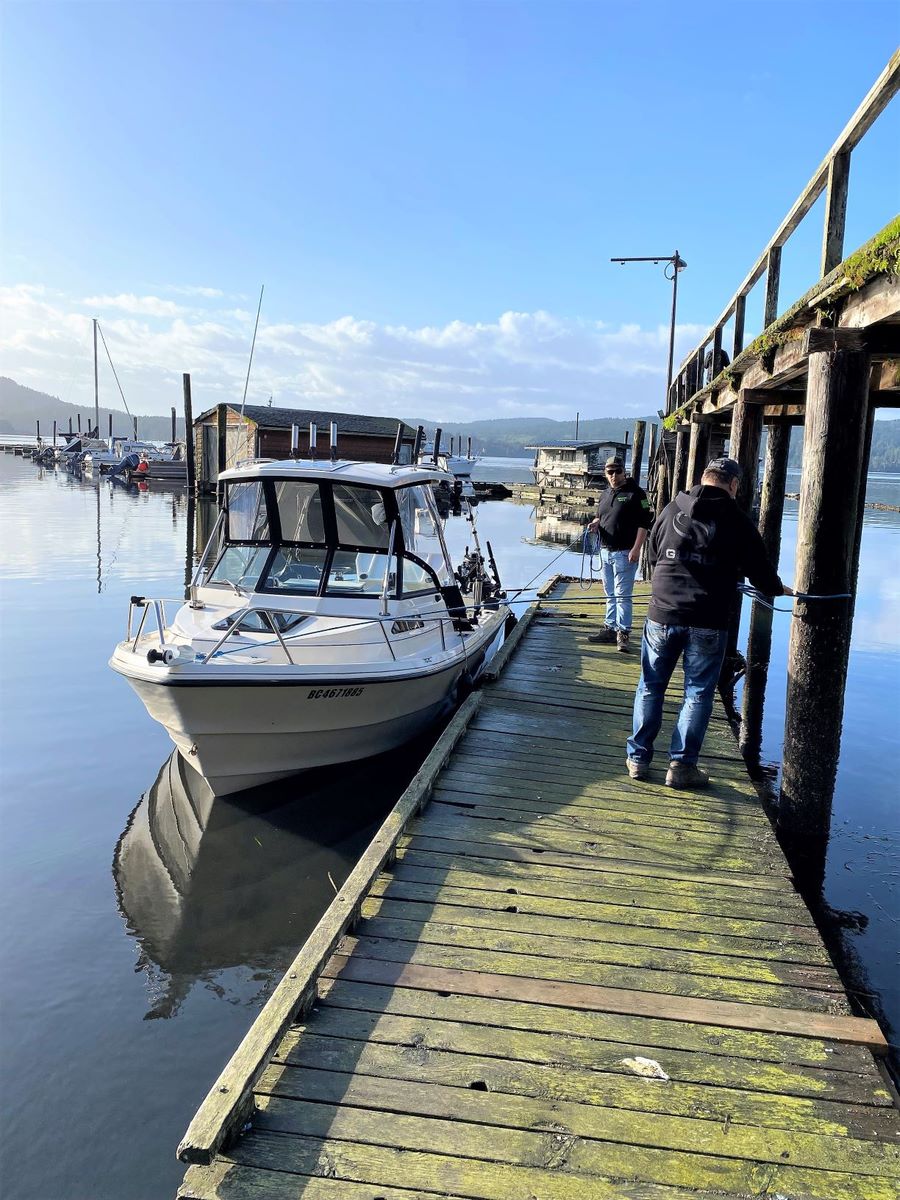 Ich lud ihn auf mein Boot ein – da konnte er sich die Arbeit sein eigenes fertig zu machen sparen. Es sollte ein windstiller Samstag werden und auch trocken bleiben. Wir trafen uns am Parkplatz eines Einkaufzentrums auf dem Weg nach Sooke und fuhren dann zusammen zur Cheanuh Marina in East Sooke. Wir waren spaet dran und es parkten schon einige leere Bootsanhaenger an der Zufahrtsstrasse entlang. Es mussten wieder sehr viele Boote auf dem Wasser sein. Aber wenn man so spaet kommt (9:00 Uhr) hat man gelegentlich das Glueck das jemand schon wieder zurueck ist – entweder mit dem Fischlimit oder mit Motorschaden. Jedenfalls wurde gerade zur rechten Zeit fuer uns ein Anhaengerparkplatz gleich gegenueber der Bootsrampe frei – Rock Star Parking! Klasse!