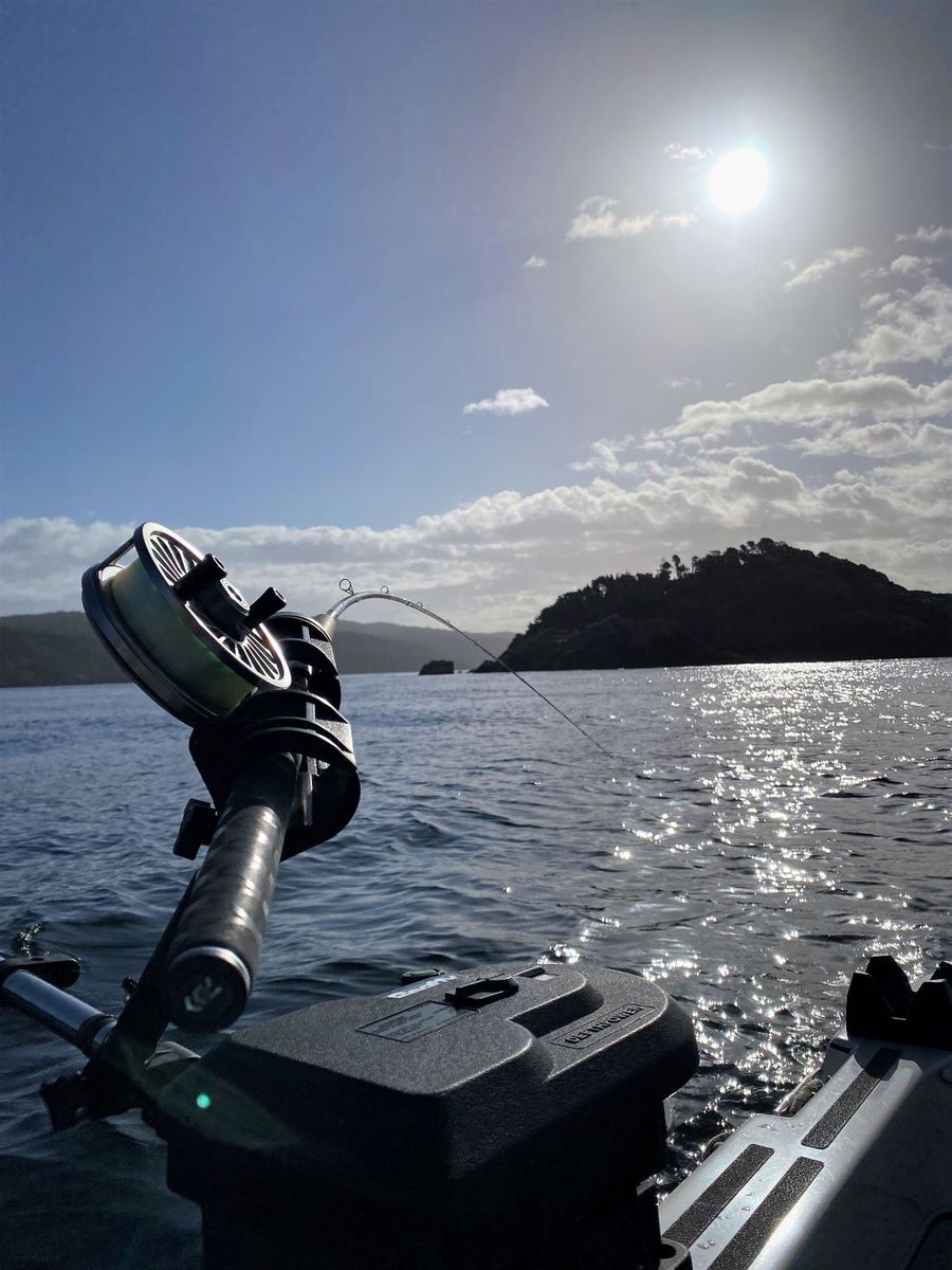 Es machte Spass mal wieder schnell ueber ein glattes Meer zu duesen. Aber ich musste oefters abbremsen denn es war einen Menge Treibgut im Wasser. Ob das was mit dem hohen Wasserstand und dem Tsunami zu tun hatte, war nicht klar. Aber aufpassen war angesagt. In Whirl Bay angekommen gesellten wir uns zu den anderen 3 Booten hinzu. Waehrend wir auftakelten, rief Ricardo schon, dass eines der Boote gerade einen Kescher benutzte. Das war vielversprechend! Ich setzte uns hinter dem Riff auf die 45m Tiefenlinie und wir liessen zwei verschiedene Blinker in Glow-Farben bis zum Boden hinab. Wenn dann wuerden wir Fisch direkt am Grund finden. Ich konnte auch gleich einige vielversprechende Echolotsignal ausmachen. Und ploetzlich ruckte es an der Cohokillerblinkerrute ungeduldig und Ricardo staunte wie schnell ich an der Rute war. Er hatte es gar nicht wirklich als Biss wahrgenommen – das ist beim Schleppen direkt am Boden auch nicht immer ganz einfach. Ich ruckte an, fuehlte den Clip ausloesen und … war am Fisch! Jawoll!