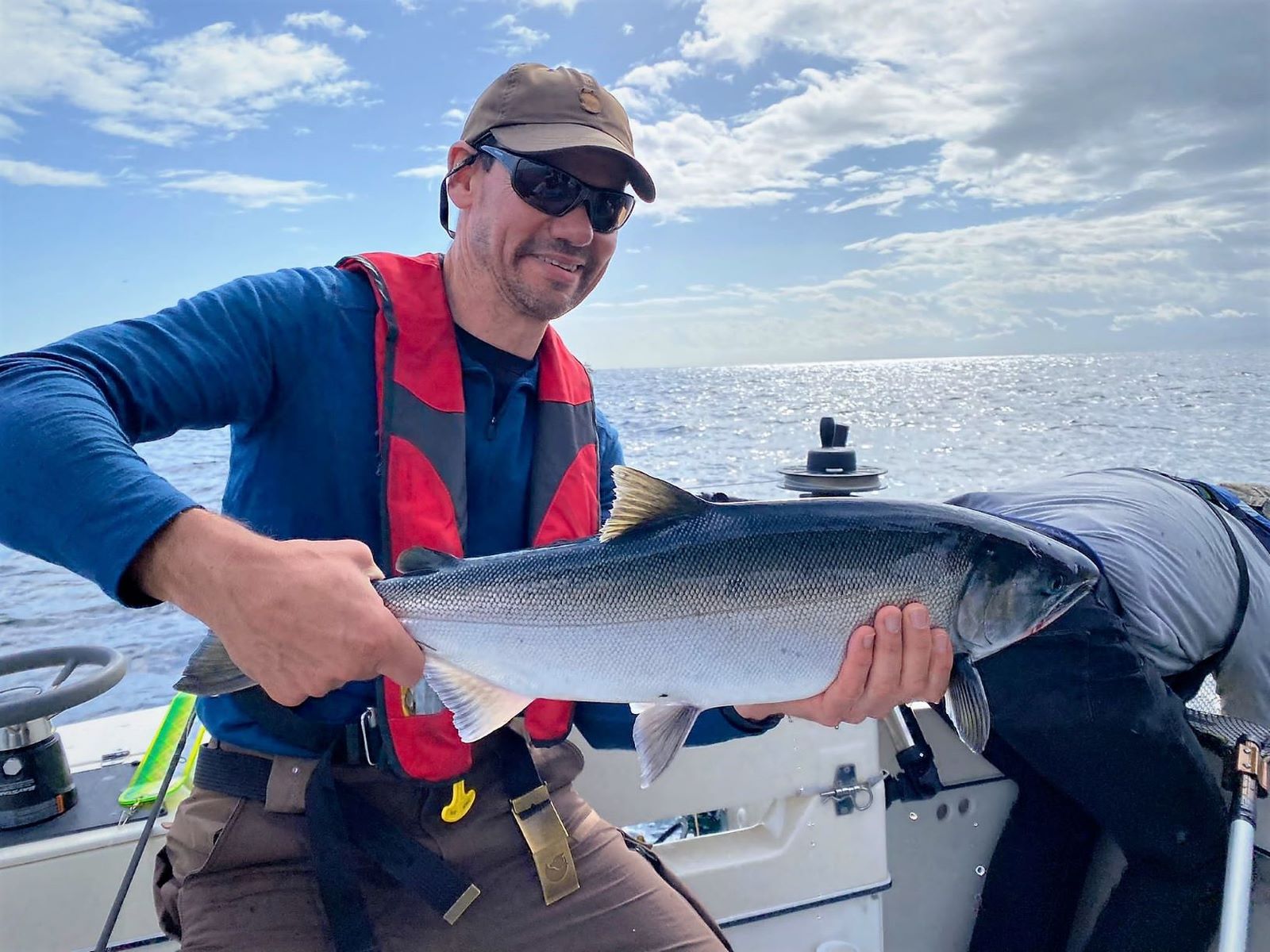 Gleiches Geschirr mit Koederfisch und wir fingen gleich bei 40m Tiefe an. Nach einer halben Stunde hatten wir nur einen Biss gehabt, der nicht verwandelt werden konnte (ich). Wir drehten weiterhin geduldig unsere Schleifen am Lizard Point und der angrenzenden Bucht. Ich brachte meinen Koeder mal bis auf 27m hoch. Als ich mich gerade wieder hingesetzt hatte, ruckte meine Rute an. Aha! Hinspringen, Rute rausreissen und anschlagen war fast eine einzige Bewegung. Der sass! Ein unwilliger Gegenzug war zu spueren. Aber ich konnte den Fisch zuerst einmal einige Meter herankurbeln. Als er in Oberflaechennaehe war, gab er Gas. Er sprang doch trotz des Flashers gut einen Meter aus dem Wasser! Wow! Sollte das ein Coho sein? Die waren eher fuer ihre Akrobatik bekannt. Aber dann war es ein guter Coho denn der Fisch war sicher knapp 10 Pfund. Der Fisch sausste hin und her und weil wir heute sogar eine dritte Rute am dritten Rigger draussen hatten, musste ich ganz schoen herumfaedeln – Rute unter und dann wieder ueber der Mittelrute durch. Bis Dave sie dann endlich aus dem Wege raeumte. Dann war der Lachs auch schon ausgepowert. Dave kescherte mal wieder einen Fisch fuer mich. Ich wuesste schon gar nicht mehr wie keschern ging, meinte ich zu ihm. Er zuckte ratlos die Schultern. Es war aber kein Coho sondern ein mittelpraechtiger Chinook.