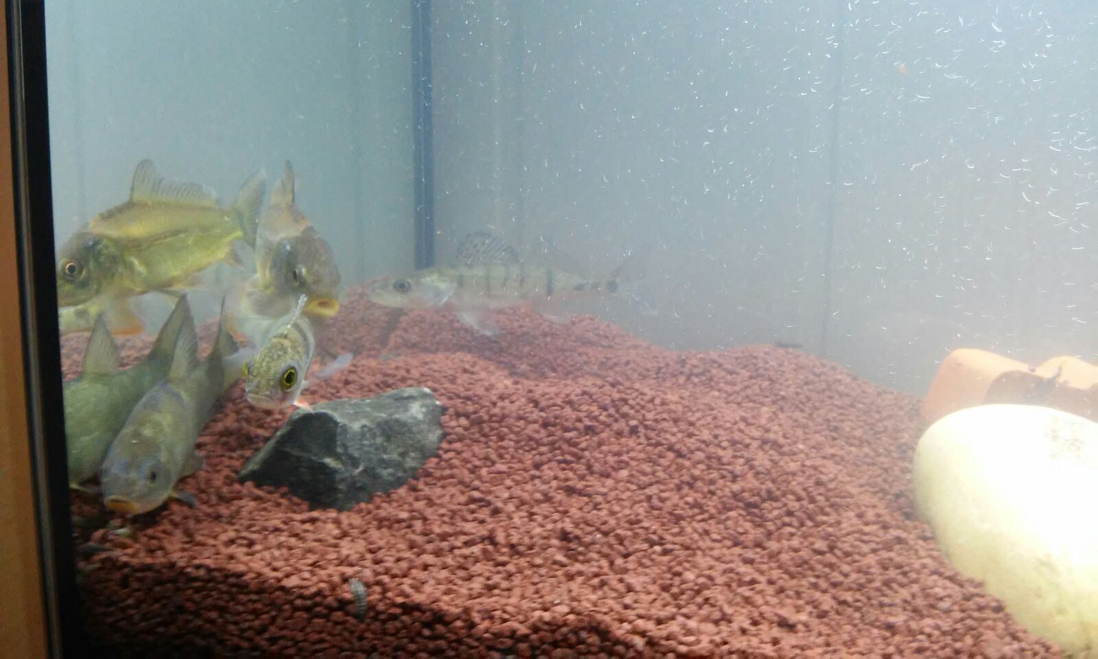 Vier Fischarten auf engstem Raum, zwei Schmelzschupper und zwei mit Kammschuppen. Alle vier drängen sich in eine Ecke des Beckens. Es gibt Bundesländer, in denen ist es untersagt, Schmelz - und Kammschupper in einem Kescher zu hältern. Fakt ist auch, dass mindestens drei dieser vier Fische ein gesetzliches Mindestmaß haben.