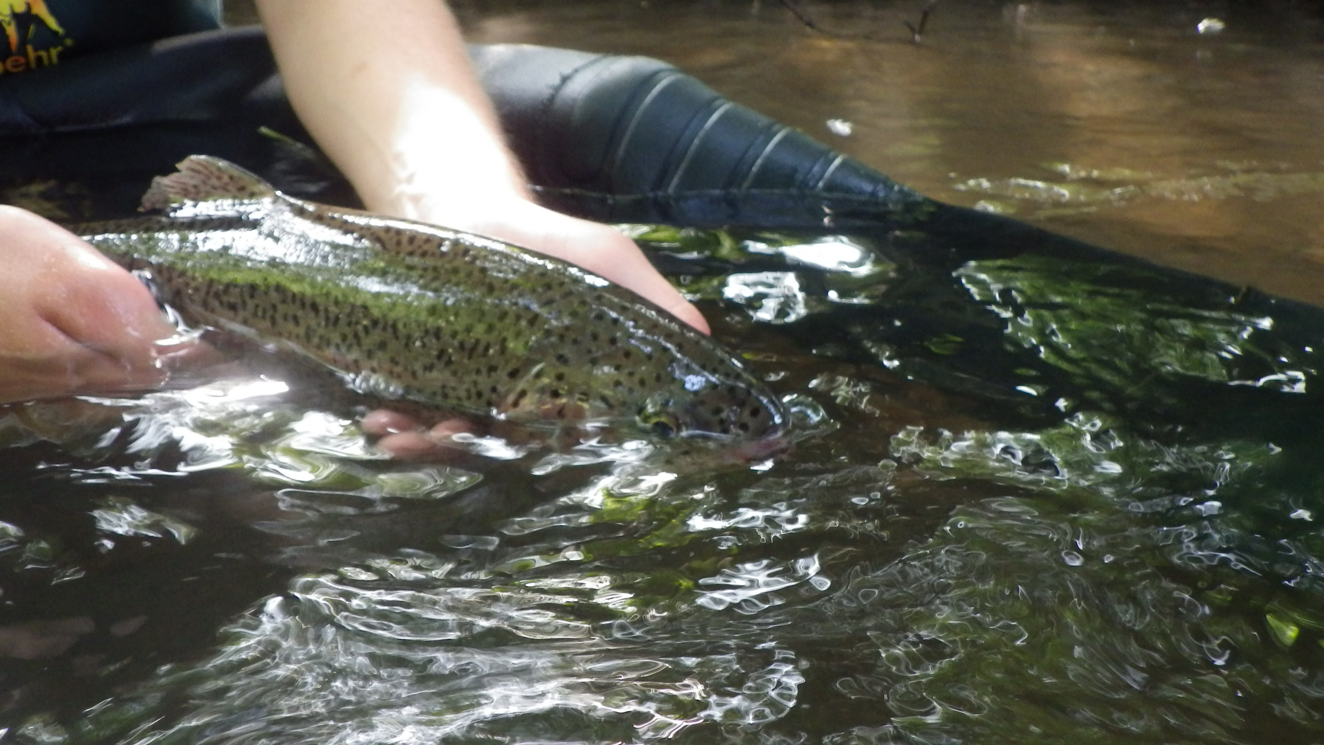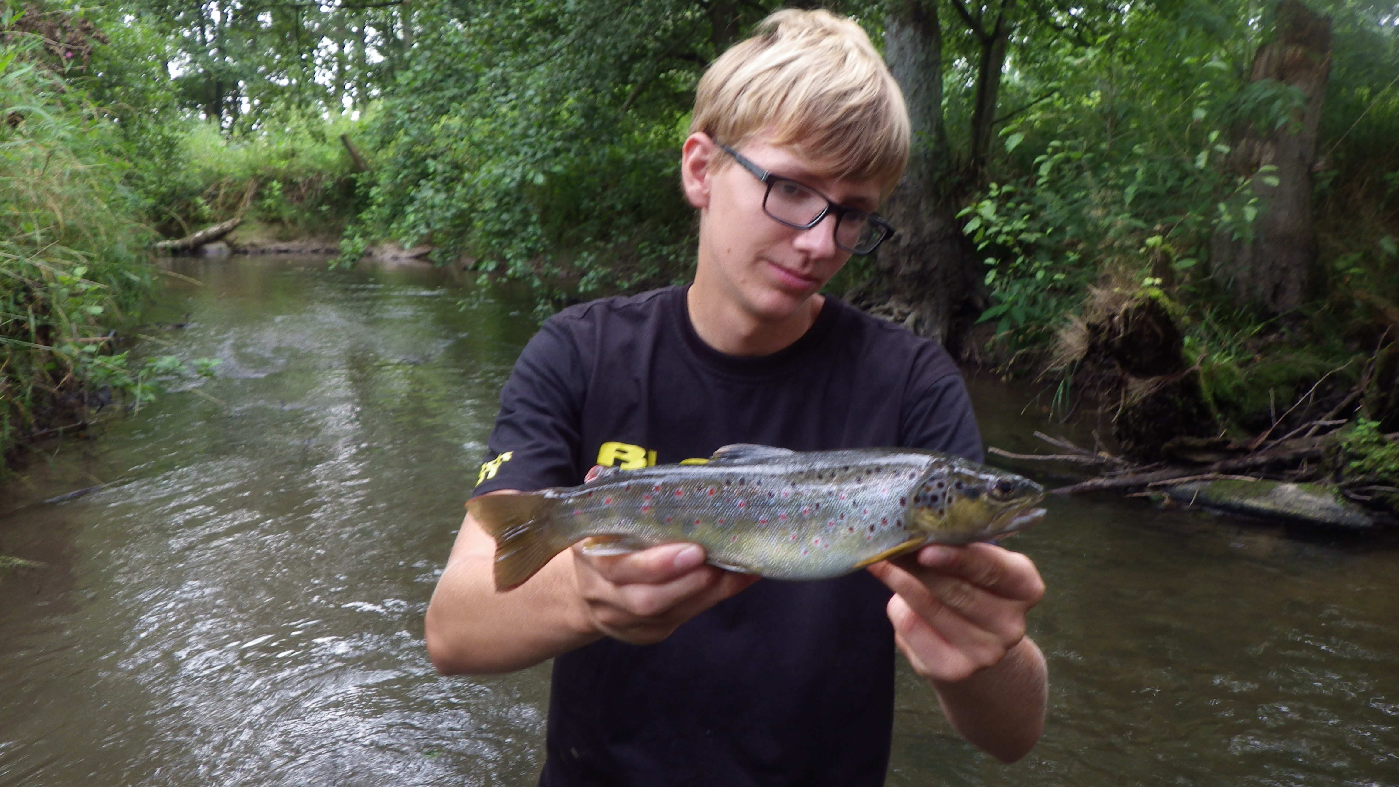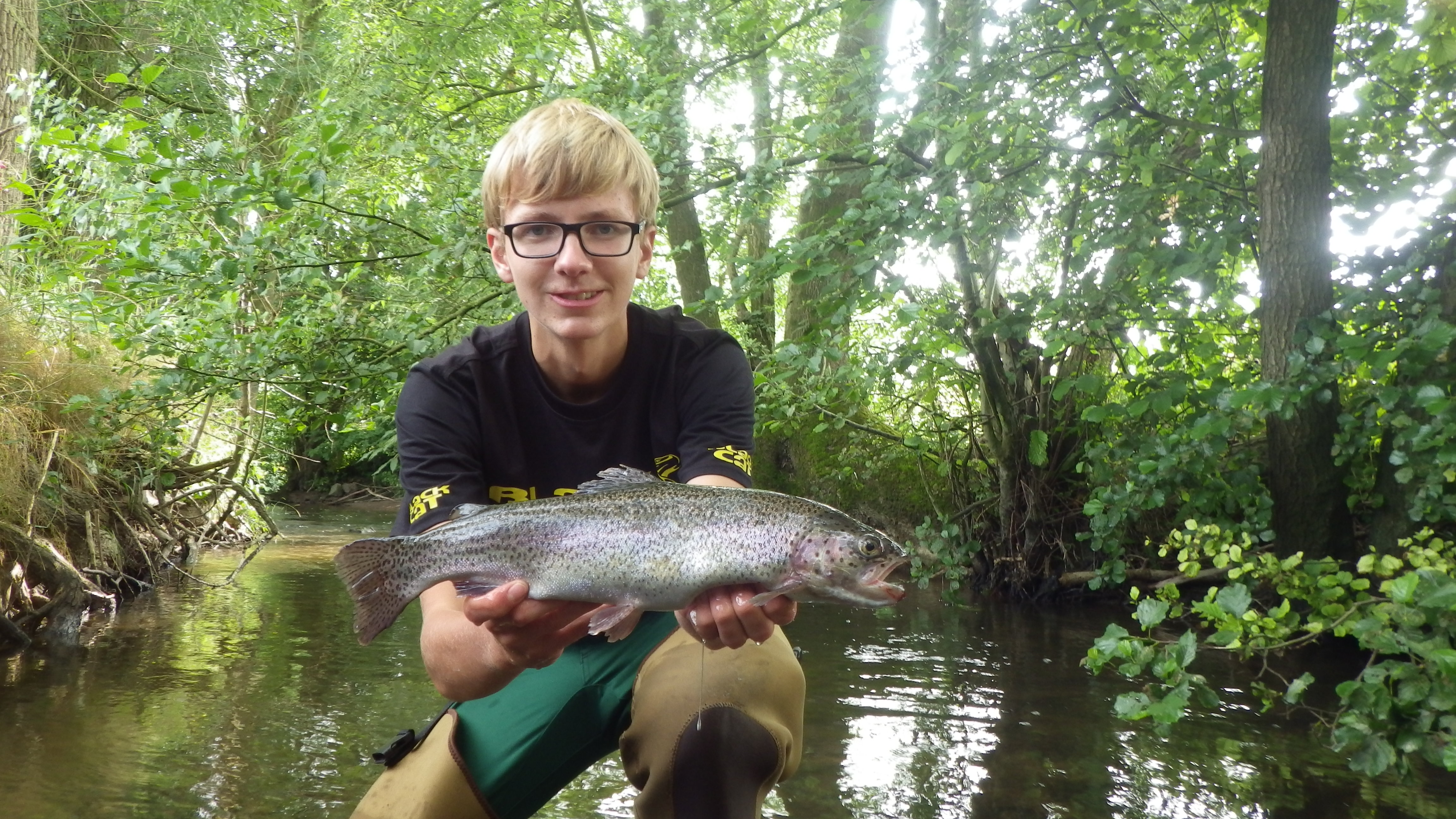 Nach kurzem Frühstück ging es dann weiter an den oberen Bereich des Flusses wo wir Watangeln wollten. Wieder fing Colin den ersten Fisch des Tages, während ich mit meinem Schlafdefizit kämpfte. Nach einer halben Stunde kamen an einen kleinen aber tiefen Kolk an dem ich mir schon seit Wochen mit dem Gummi die Zähne ausgebissen habe. Ich ließ Colin den Vortritt. Als sein Gummi beim 3. Wurf nur wenige Zentimeter neben dem unterspülten Baum, unter dem sich der tiefste Bereich des Kolkes befindet landete, war mir sofort klar, dass er einen Biss haben wird. Und tatsächlich, es sollte nur Sekunden dauern bis sich seine Rute bog und die Bremse anlief. Nach einigen Minuten lag eine 43er Regenbogenforelle in unserem Kescher und Colin stand die Freunde ins Gesicht geschrieben.
