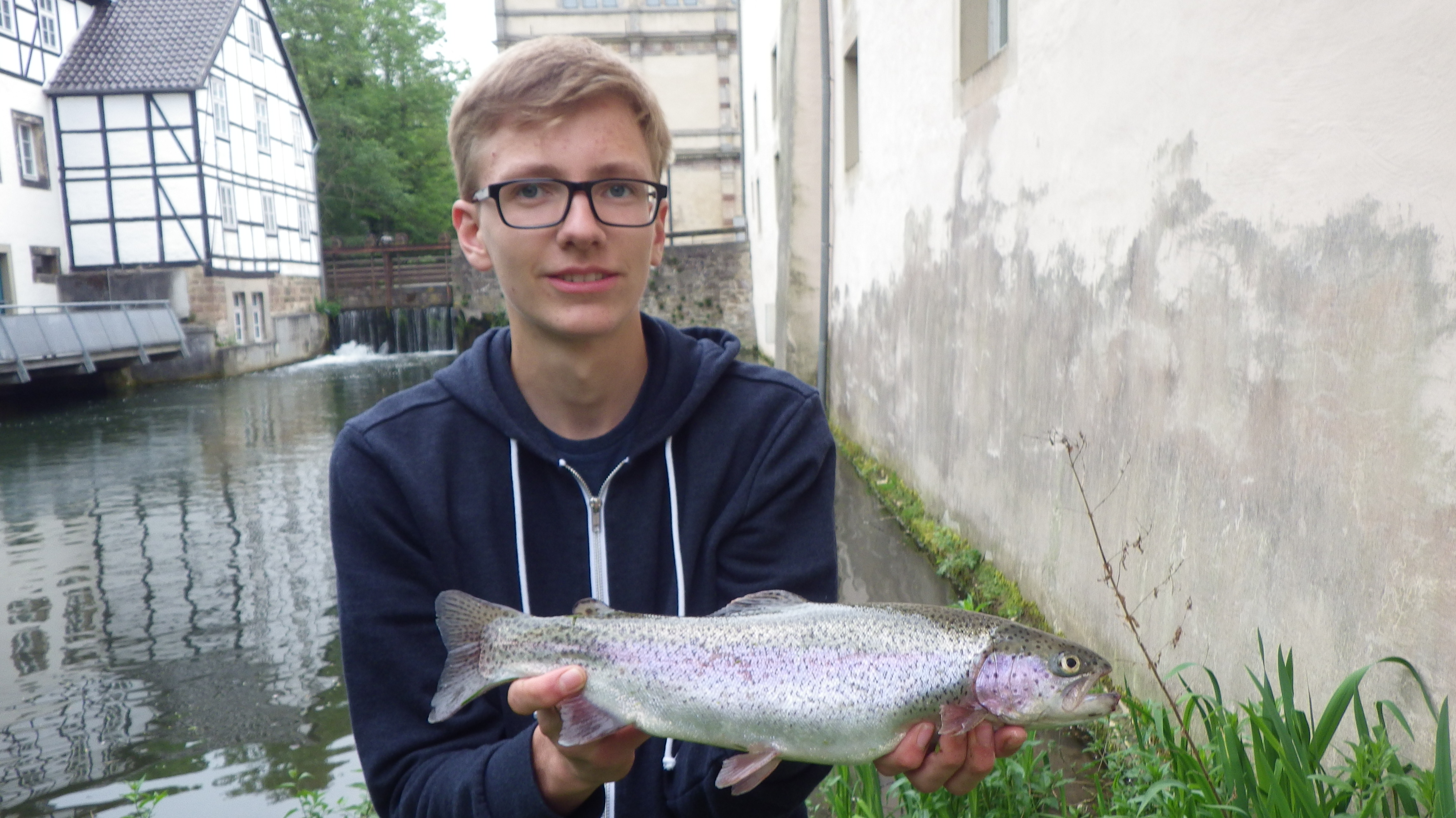Eine lange Silberflanke blitze zwischen den Ästen auf, schoß auf meinen Köder zu und schlug gnadenlos ein. Ich setzte den Anhieb und der Fisch schoß sofort wieder auf die Äste zu, wobei er ihnen bedrohlich nahe kam. Ich versuchte gnadenlos den Fisch vom Hindernis wegzubekommen und in der nächsten Sekunde war der Widerstand fast weg. Ich kurbelte wie verrückt und konnte den Kontakt wierder aufnehmen, als der Fisch direkt vor meinen Füßen stromab schoß. Mein Puls stieg gefühlt auf 300 an doch die gefährlichste Phase des Drills war vorbei und ein paar Fluchten später konnte Colin meine Regenboenforelle von 42,5 cm und knapp über 900g in den Kescher bugsieren. (Heimsieg Juhuuuu!!! :dance: )