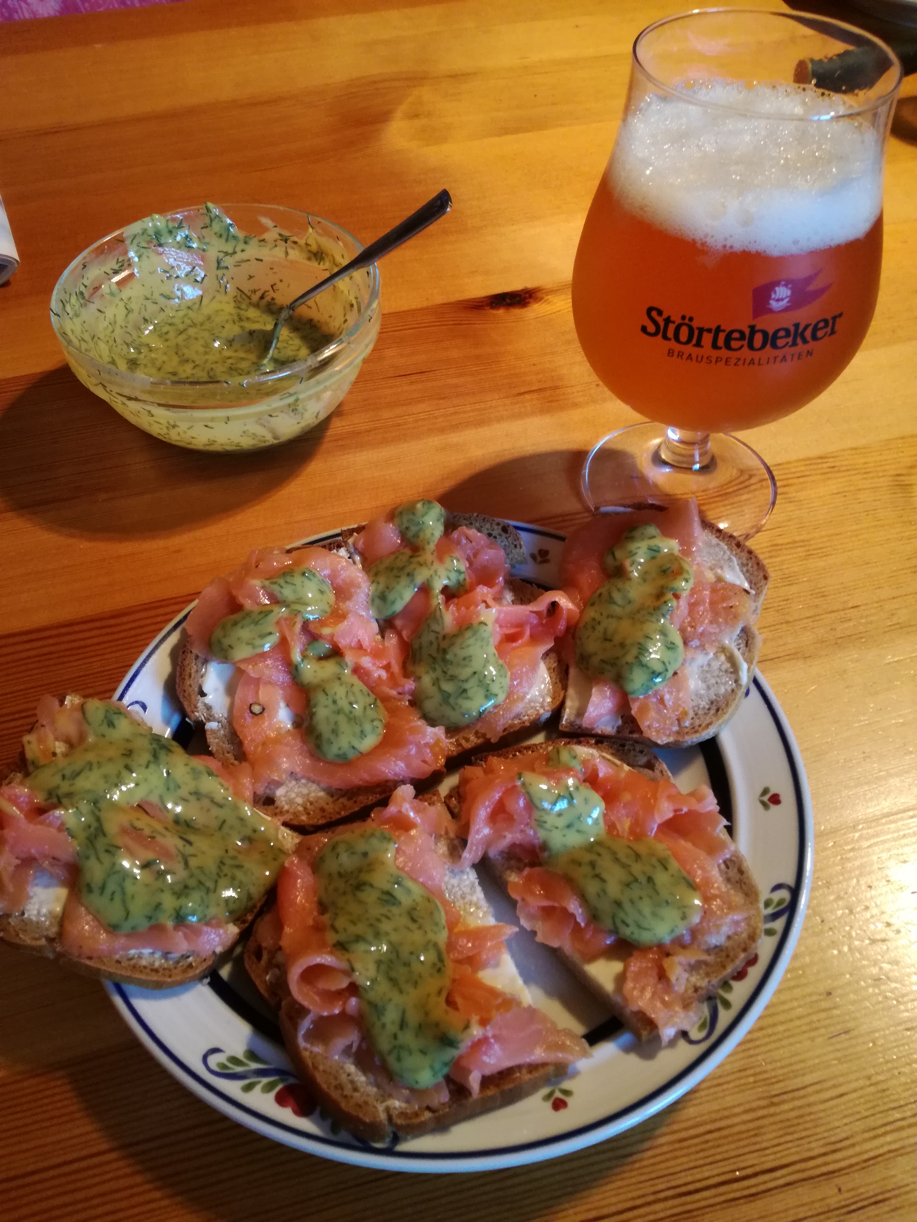 Dazu wurd sich ein Störtebeker Bernstein Weizen genehmigt, das passt übrigens auch zu anderen Fischgerichten sehr gut!