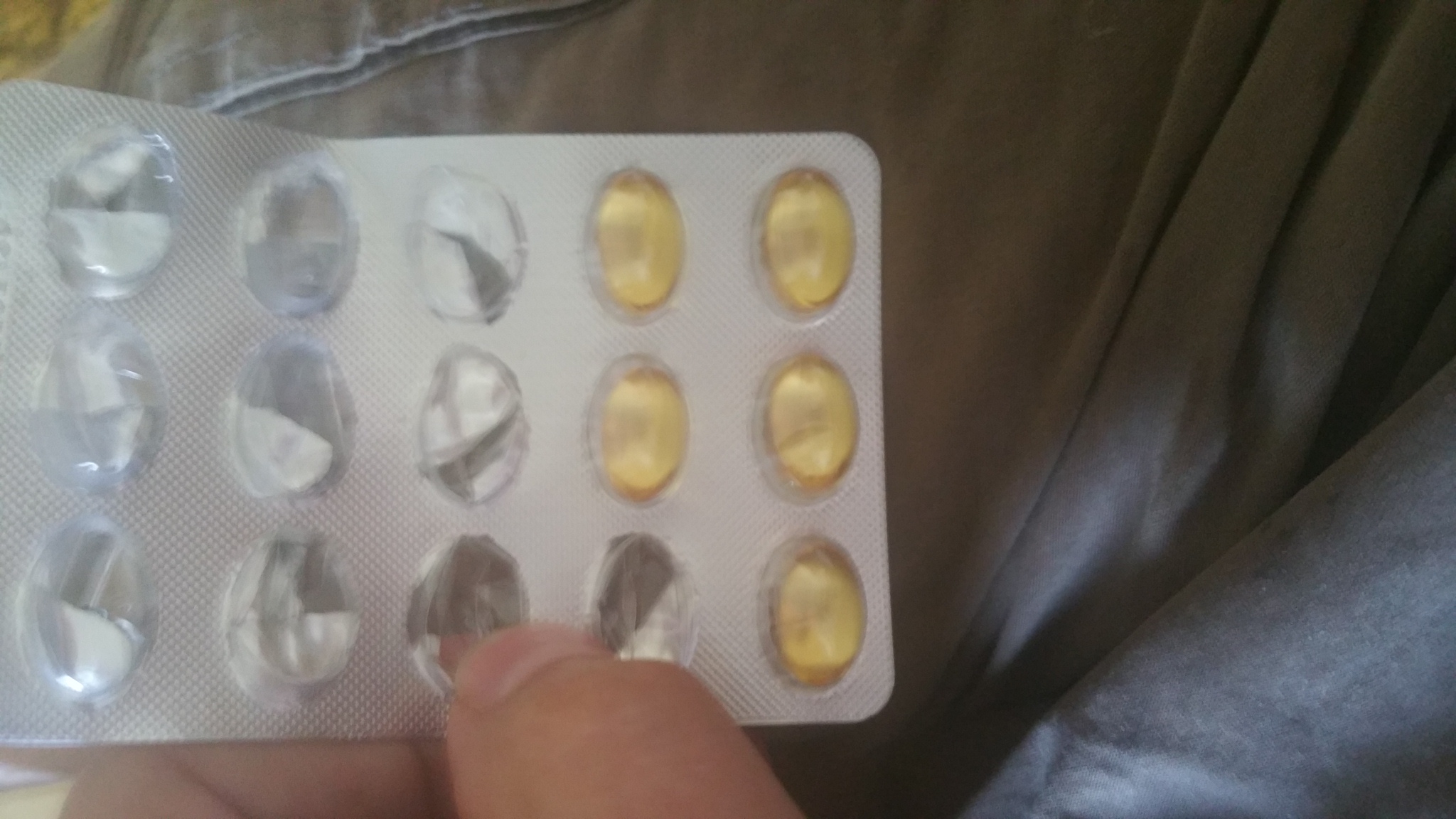 Die ausgedrückten Gelatinekapseln kann man ruhig zerkauen, da ist noch viel Wirkstoff (Vitamin E ) drin.