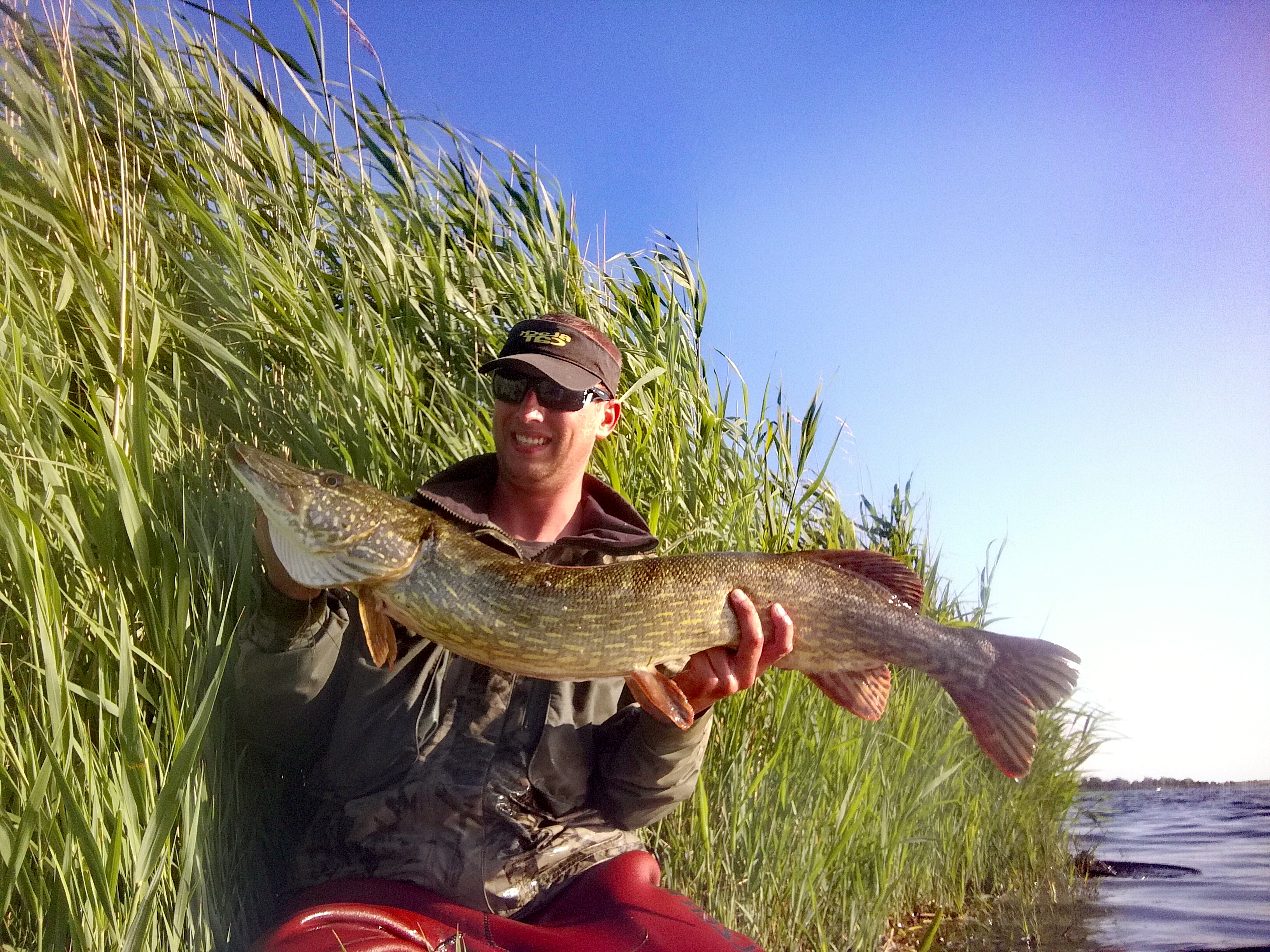 Ich watete weiter, entschied mich Strecke zu machen und immer weiter zu werfen. Trotzdem war erstmal wieder ein wenig Ruhe. Ständig musste Treibkraut vom Köder entfernen und so kam das erste “Übel“. Ein vermeintlicher Krautballen entpuppte sich als richtig starker Hecht. Ich hatte natürlich keinen vernünftigen Anhieb gesetzt, dachte ja es wär Kraut, und der Hecht nutzte seine Chance und war weg....