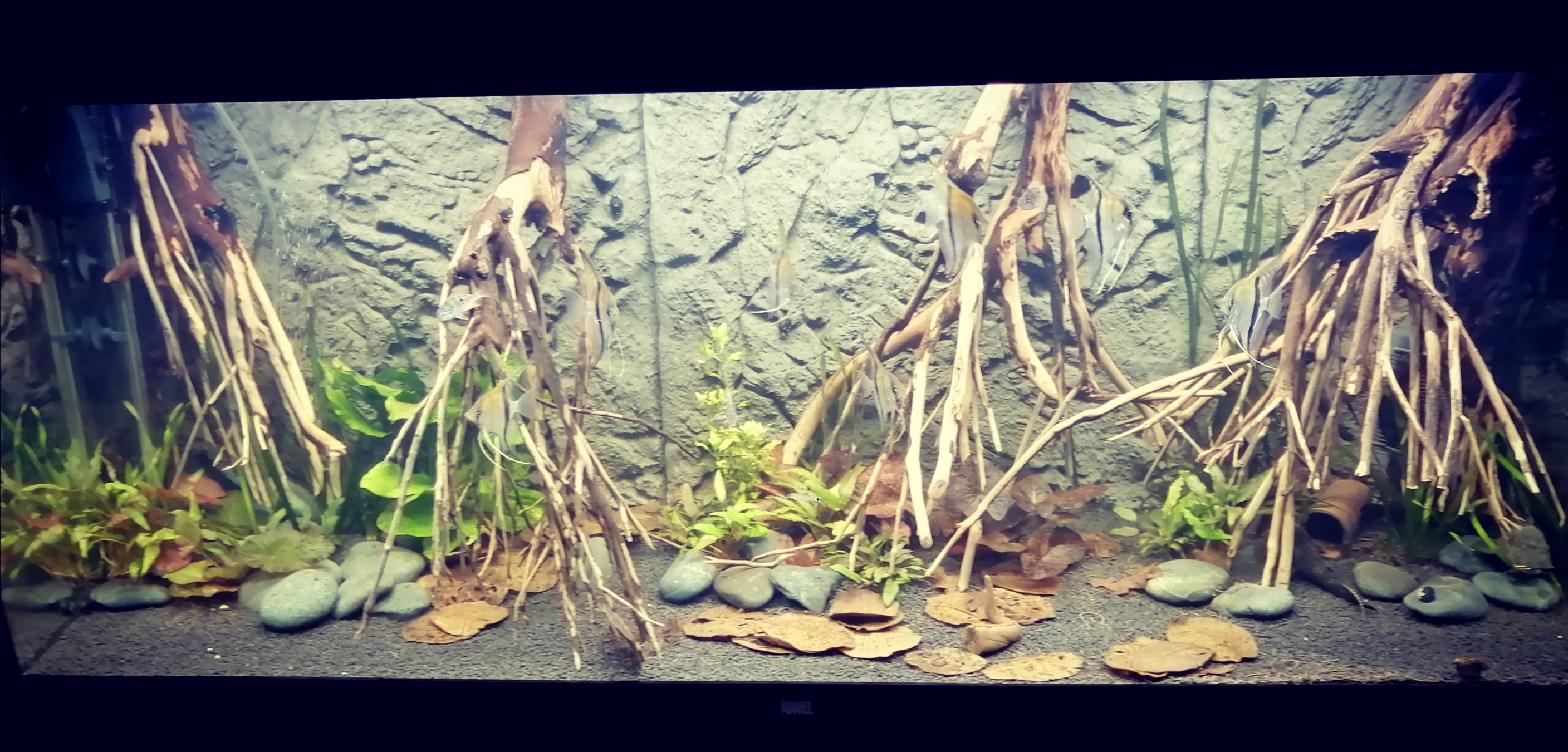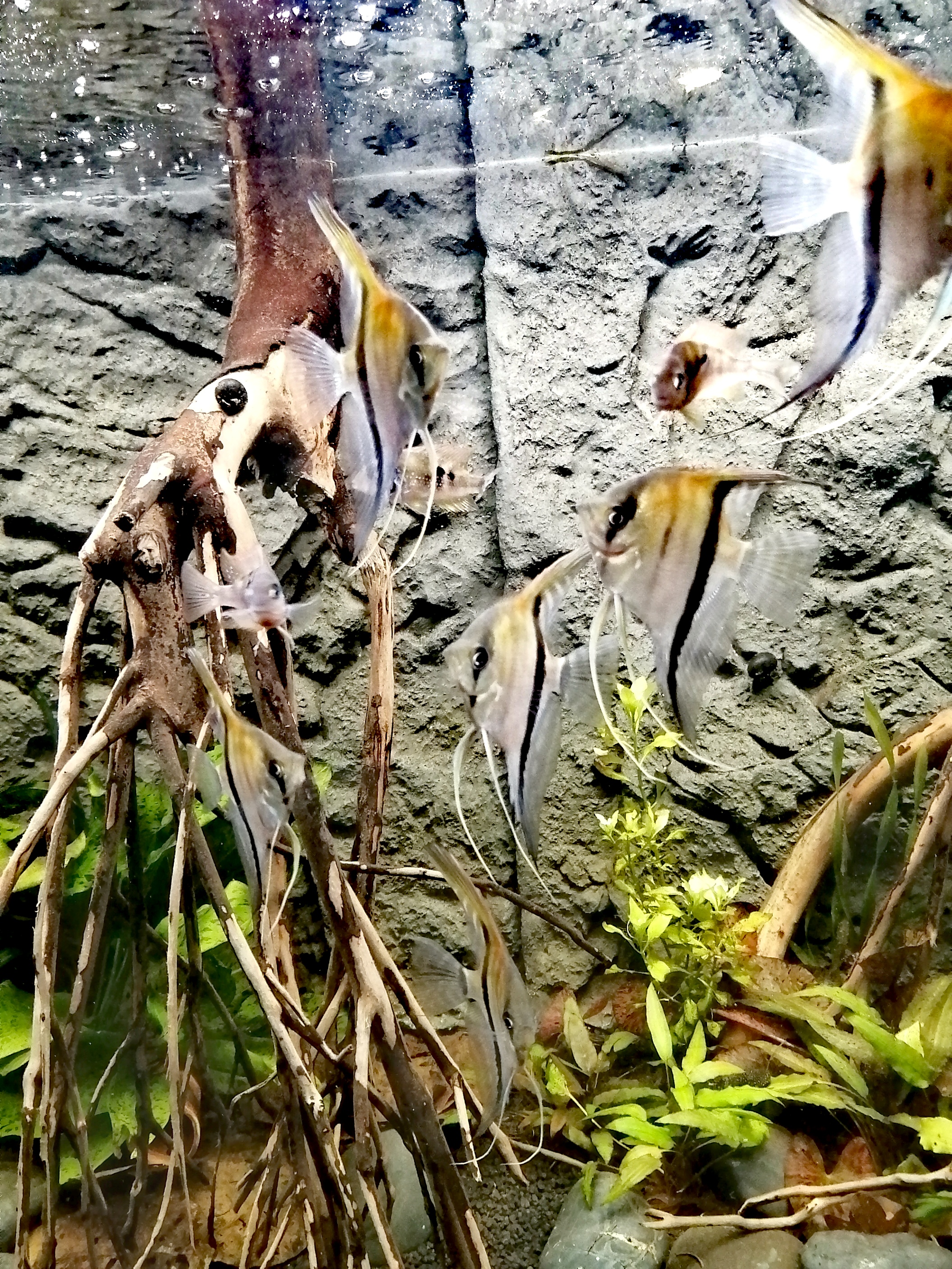 Die Skalare schwimmen wunderbar in der Gruppe zusammen, sind deutlich friedlicher und im Verhalten schöner anzusehen, als die Koi, Platin und andere Zuchtformen, die einfach nicht mehr kommunizieren können. Die Welse hängen zum Großteil unter oder in der Nähe einer Wurzel, da is es schön schattig.