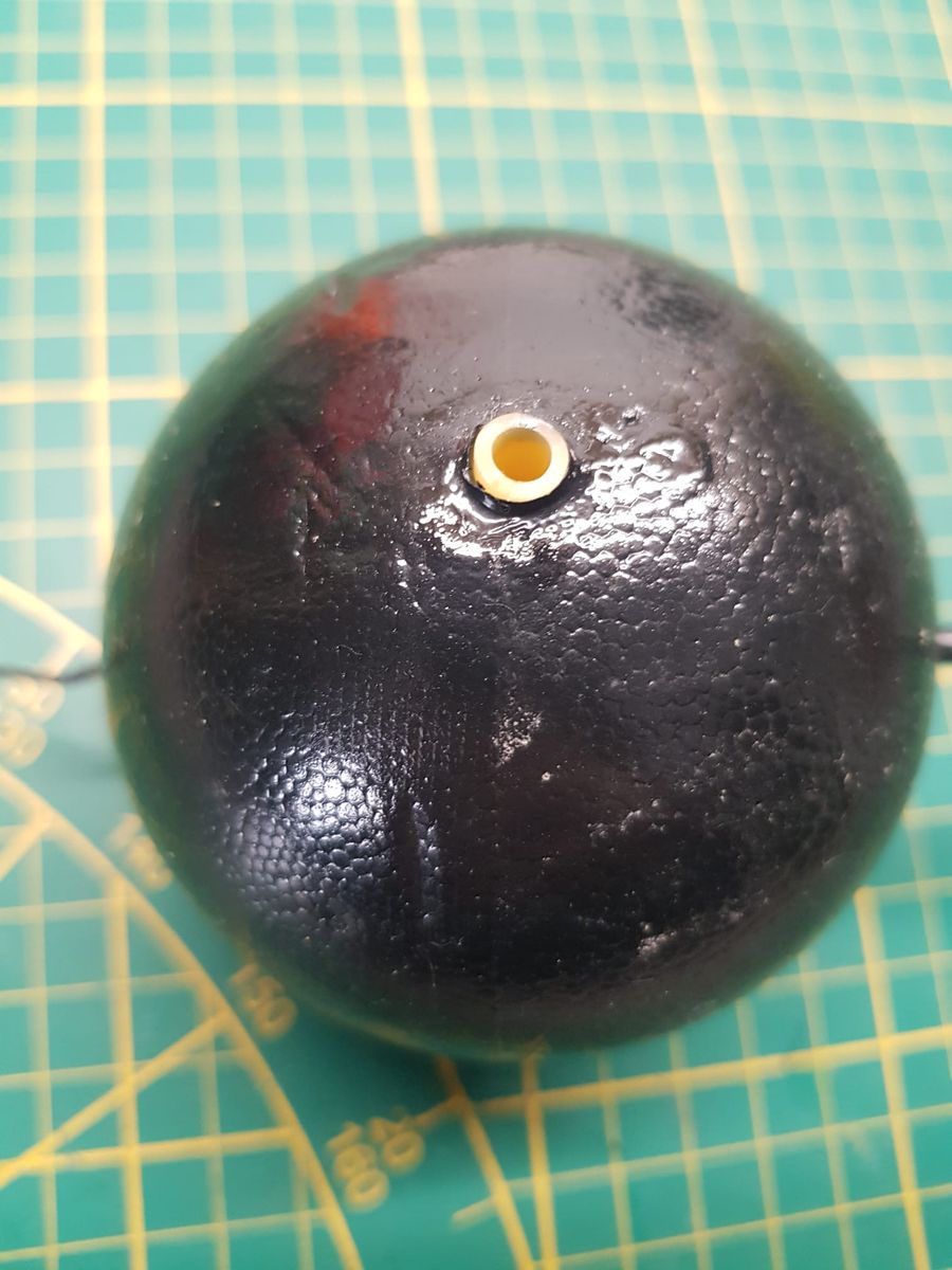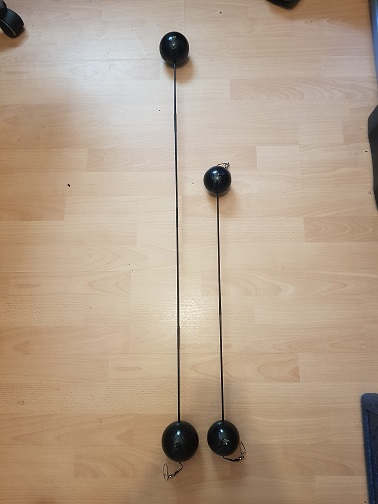 An dem Stab habe ich die Geflochtene mittels Panzerklebeband gefestigt dann in die Styroporkugeln Mittig Löcher gemacht und die dann auf den Stab geschoben, die Löcher sollten etwas kleiner sein wie der Stab im Durchmesser, die Kugeln habe ich mit 3 Holzschrauben auf einer Seite beschwert, auf der gegenüberliegende Seite habe ich dann einen Silicon Schlauch rein geklebt die später für die Knicklichter da sind, jetzt nur noch die Wirbel mit den Karabiner befestigen und zum Schluss die Kugeln mit Der Acrylfarbe angemalt die Löcher in dem der Stab steckt habe ich mit Farbe ausgefüllt das gibt dem ganzen noch einen besseren halt.