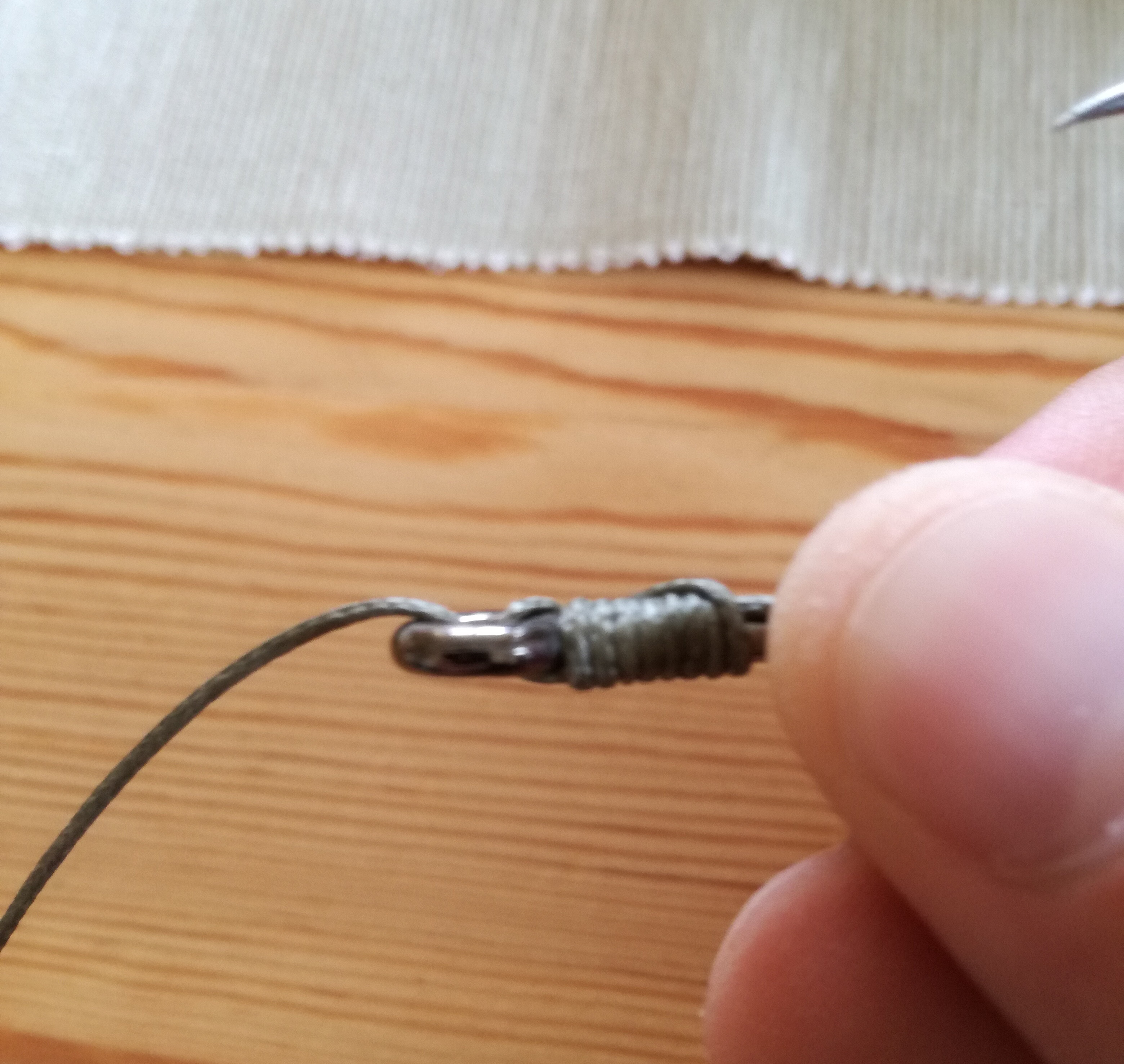 Jetzt mit der Schnur 6-7 Wicklungen um den Hakenschenkel legen, dabei drauf achten dass die Wicklungen schön nebeneinander liegen. (Mit dem vorderen Schnurende, das andre bleibt fixiert am Schenkel)