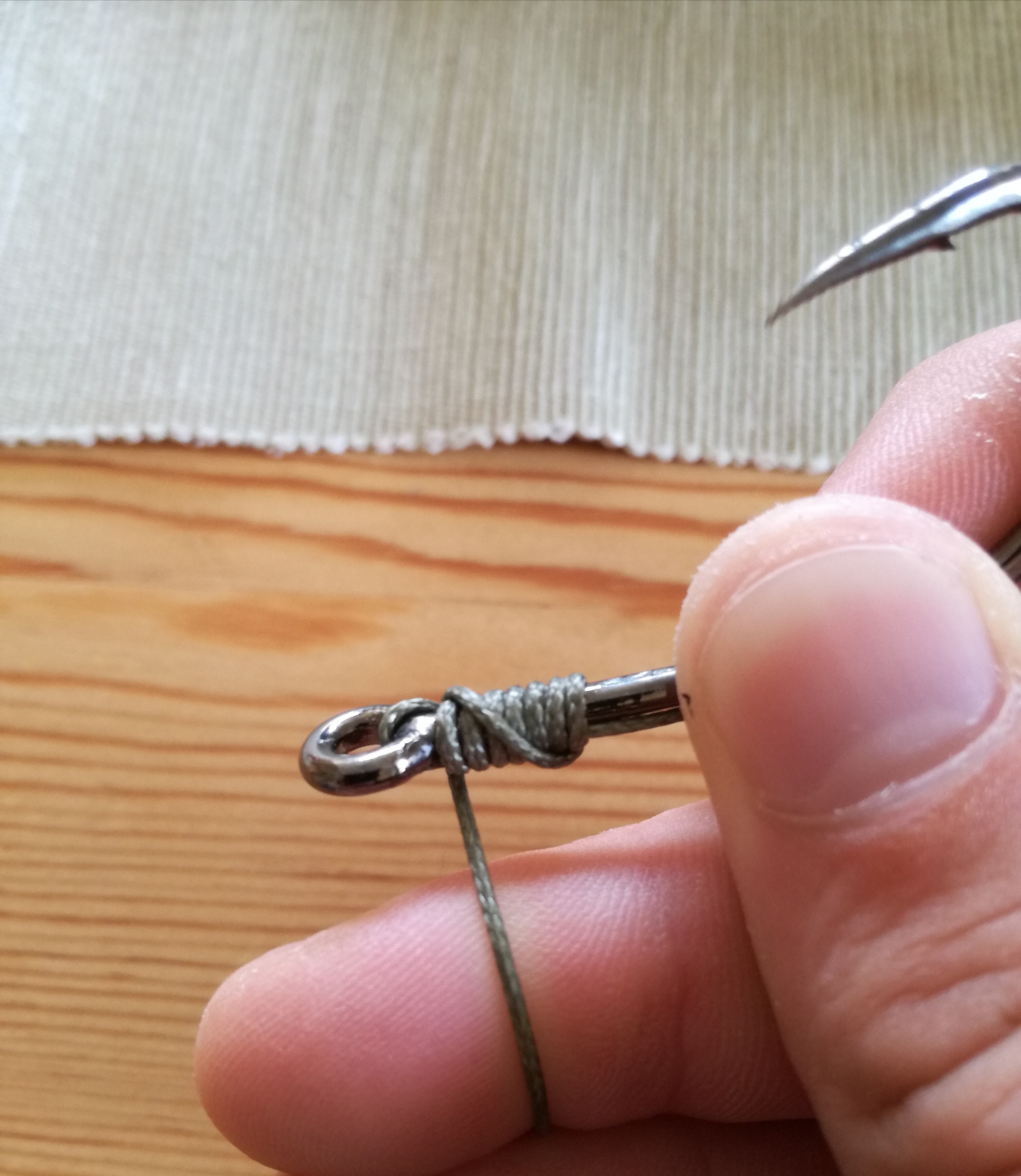 Zuerst mit dem Vorfachmaterial von oben nach unten durch das Öhr, dann das Material am Hakenschenkel fixieren.
