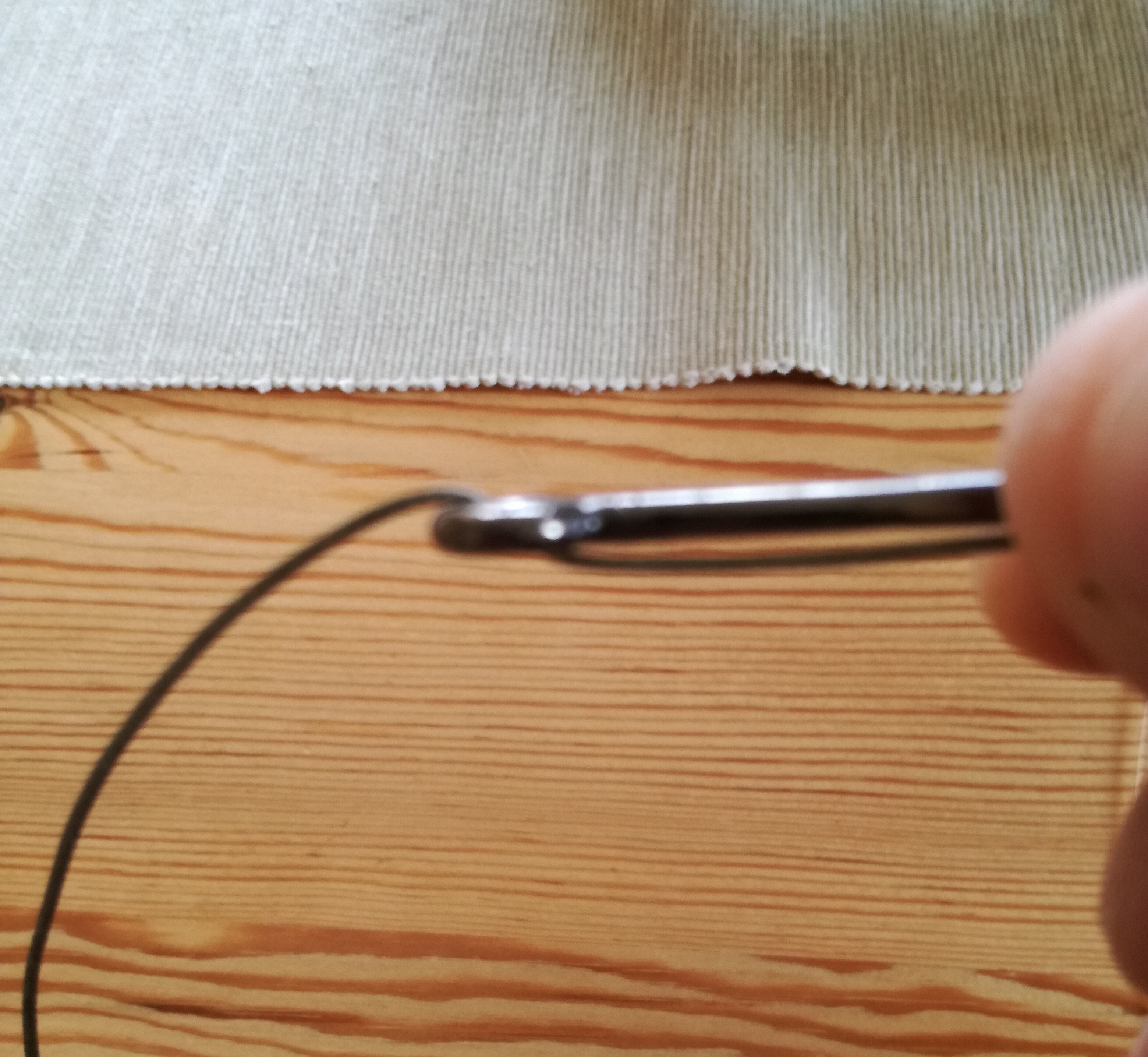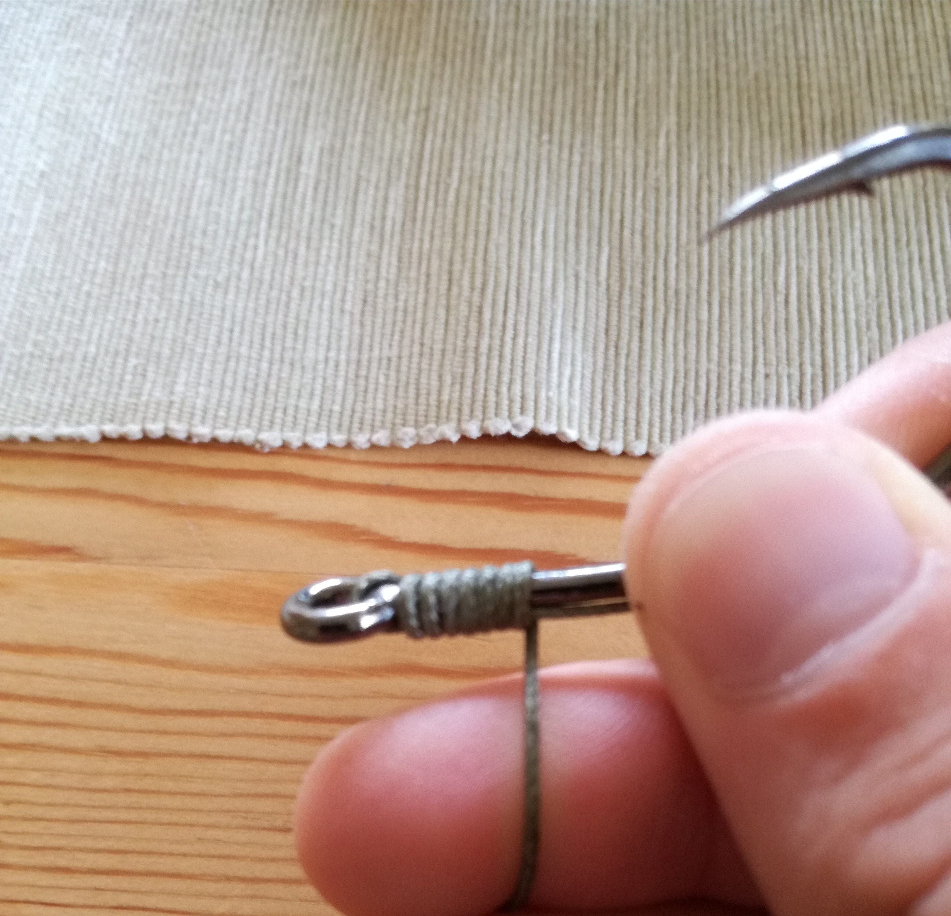 Dann wieder durch das Öhr, mit Spucke den “Knoten“, der keiner ist, befeuchten und zuziehen.
