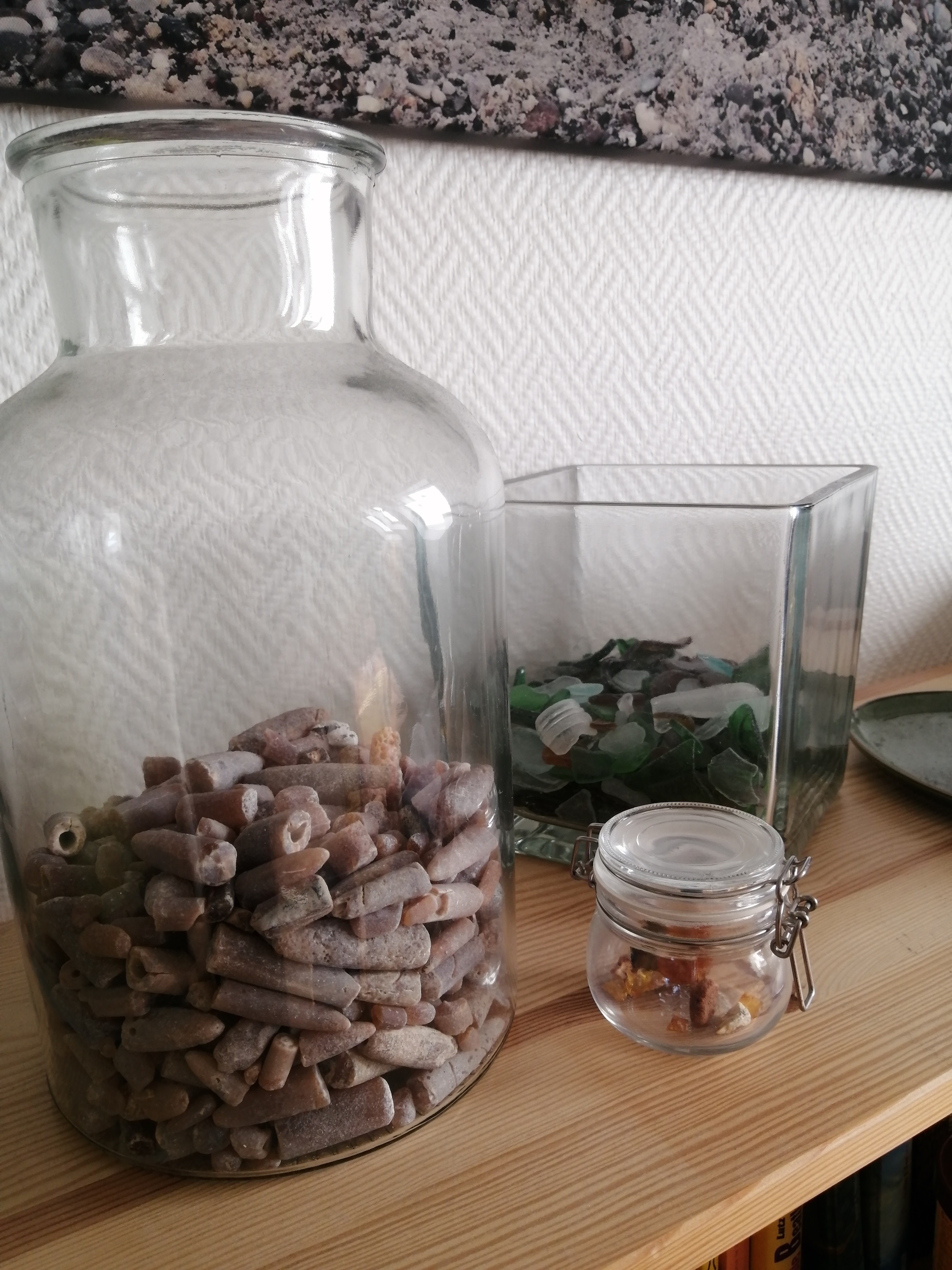 Sämtliches Strandgut habe ich in Glas aßen zur Deko stehen.Bei Bernstein ist es noch etwas wenig.