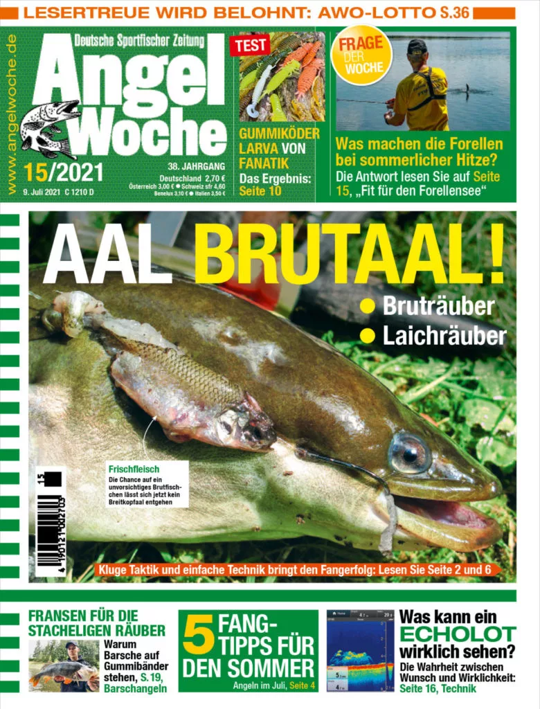 Mit einem Köderfisch kann man jetzt, wo sich die Breitkopfaale die Chance auf ein unvorsichtiges Brutfischchen nicht entgehen lassen, sehr gute Angeltage (oder Nächte) auf Aal erleben. Aber wer glaubt, Aalangeln sei einfaches „Plumpsangeln“ auf Grund, der sollte sich nicht wundern, wenn er nichts fängt. Kluge Taktiken und einfache Techniken finden Sie unter anderem im Foto-Report der aktuellen AngelWoche 15!